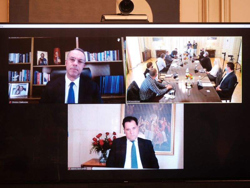 Μέσω τηλεδιάσκεψης συμμετείχαν ο Υπουργός Οικονομικών, Χρήστος Σταϊκούρας και ο Υπουργός Ανάπτυξης και Επενδύσεων, Άδωνις Γεωργιάδης.