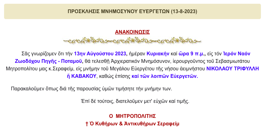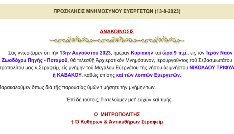 Σᾶς γνωρίζομεν ὅτι τήν 13ην Αὐγούστου 2023, ἡμέραν Κυριακήν καί ὥραν 9 π.μ., εἰς τόν Ἱερόν Ναόν Ζωοδόχου Πηγῆς – Ποταμοῦ, θά τελεσθῇ Ἀρχιερατικόν Μνημόσυνον, ἱερουργοῦντος τοῦ Σεβ. Μητροπολίτου μας κ.Σεραφείμ, εἰς μνήμην τοῦ Μεγάλου Εὐεργέτου τῆς νήσου ἀειμνήστου ΝΙΚΟΛΑΟΥ ΤΡΙΦΥΛΛΗ ἤ ΚΑΒΑΚΟΥ, καθώς ἐπίσης καί ὅλων τῶν λοιπῶν Εὐεργετῶν τῆς νήσου μας.
