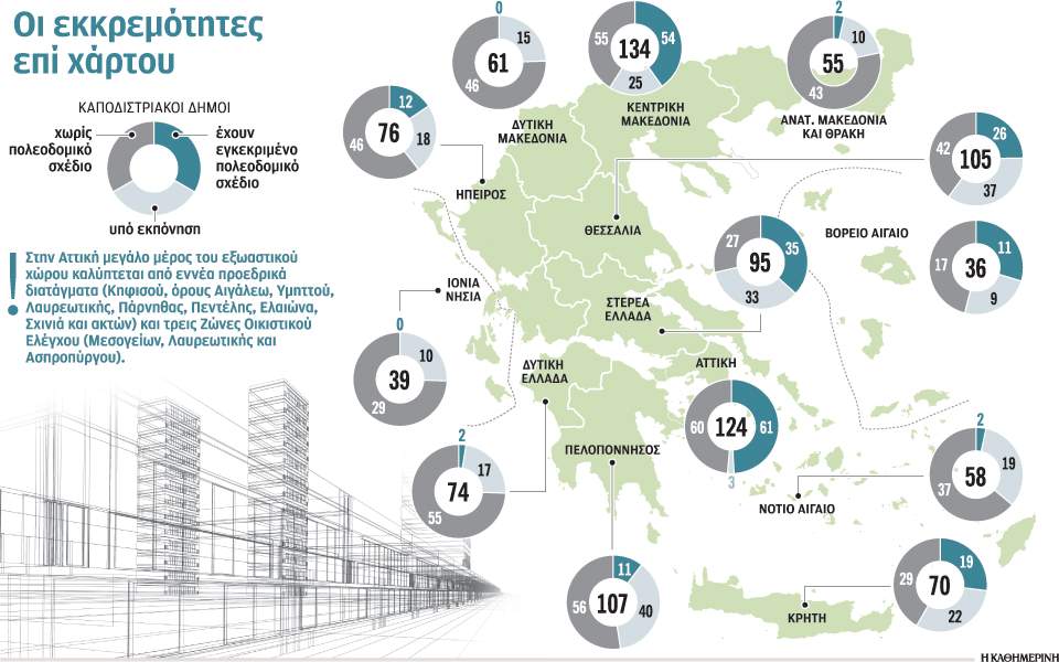 Πιο συγκεκριμένα, σε επίπεδο καποδιστριακών δήμων, προ Καλλικράτη δηλαδή, (στη βάση των οποίων είχαν προκηρυχθεί τα πολεοδομικά σχέδια), από τους 910 δήμους (τότε) όλης της Ελλάδας, πλην Αττικής, εγκεκριμένα είναι τα σχέδια για 174 δήμους ή δημοτικές ενότητες, 254 βρίσκονται σε εξέλιξη, ενώ 482 δήμοι παραμένουν χωρίς πολεοδομικό σχεδιασμό. Ξεχωρίζουν οι Περιφέρειες Δυτικής Μακεδονίας και Ιονίων Νήσων, όπου δεν υπάρχει… ούτε ένα εγκεκριμένο σχέδιο σε 61 και 39 (καποδιστριακούς) δήμους αντιστοίχως και οι Περιφέρειες Ανατολικής Μακεδονίας-Θράκης, Δυτικής Ελλάδας και Νοτίου Αιγαίου, όπου υπάρχουν μόλις δύο εγκεκριμένα πολεοδομικά σχέδια, σε 55, 74 και 58 δήμους αντιστοίχως.