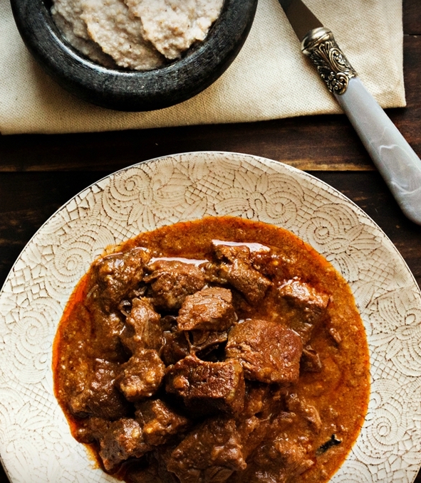 -Κοκκινίζουμε το κρέας, το σβήνουμε με το κρασί και το αφήνουμε να βράσει 3 ½ ώρες σε σιγανή φωτιά μαζί με τα μυρωδικά και το σκόρδο.