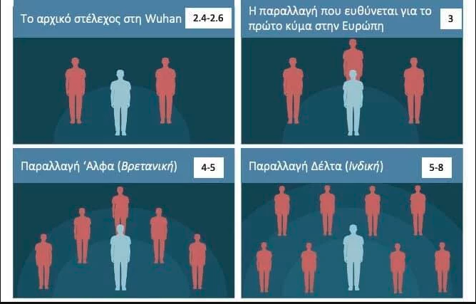 Όπως φαίνεται από τα συγκριτικά στοιχεία, σε σχέση με το αρχικό στέλεχος του ιού στην Κίνα (με R0 2,4-2,6) και εκείνο που προκάλεσε το πρώτο πανδημικό κύμα στην Ευρώπη (το R0 είχε υπολογιστεί στο 3), η βρετανική παραλλαγή Αλφα έχει R0 από 4 έως 5, ενώ η ινδική παραλλαγή Δέλτα φαίνεται να αντιστοιχεί σε R0 μεταξύ 5 και 8, δηλαδή κάθε άνθρωπος που μολύνεται μπορεί δυνητικά να μεταδώσει τον ιό σε πέντε έως οκτώ άτομα.