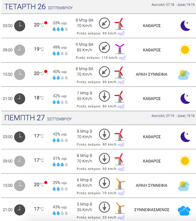 Σύμφωνα με τις προβλέψεις αυτές κύριο χαρακτηριστικό της καιρικής μεταβολής θα είναι οι θυελλώδεις Βόρειοι άνεμοι η ένταση των οποίων από ενωρίς το πρωί της Τετάρτης 26 Σεπτεμβρίου θα φθάσουν και τα 9 μπ., ενώ αναμένονται ριπές ανέμου, οι οποίες μπορεί να ξεπερνούν ακόμα και τα 10μπ.