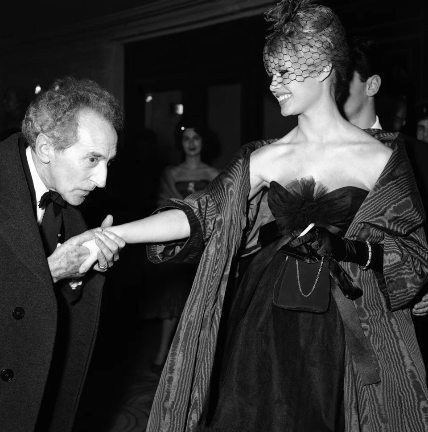 Η Μπριζίτ Μπαρντό χαμογελά, καθώς ο Γάλλος συγγραφέας, ζωγράφος και σκηνοθέτης Ζαν Κοκτό σκύβει για να φιλήσει το χέρι της, στις 22 Δεκεμβρίου 1958 / Φωτογρααφία: AP