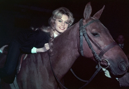 Η Μπριζίτ Μπαρντό με το αγαπημένο της άλογο, κατά τη διάρκεια προπόνησης σε σχολή ιππασίας στο Παρίσι για την επερχόμενη ταινία της το 1958, στην Ισπανία / Φωτογραφία: AP