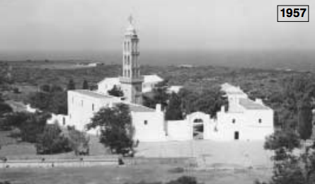 Η πρώτη, έχει ληφθεί το 1936 ή λίγο ενωρίτερα, αφού την στέλνουν ως ενθύμιο και με ευχές για το «Νέον έτος 1937». Έχει ενδιαφέρον το χωμάτινο προαύλιο, στο οποίο δεν υπάρχει ακόμη το γνωστό πηγάδι. Βλέπουμε ένα αυτοκίνητο, άγνωστο ποιο είναι και έχει ενδιαφέρον ότι μακριά στον ορίζοντα το τοπίο είναι σχεδόν φαλακρό και φυσικά άδενδρο. Το μεγάλο, σήμερα, κυπαρίσσι στο προαύλιο υπάρχει, λείπουν όμως τα πεύκα και οι ευκάλυπτοι, πως και πολλά ελαιόδενδρα. Στη δεύτερη φωτογραφία (22 Δεκεμβρίου 1957) βλέπουμε στρωμένο το προαύλιο, το πηγάδι φαίνεται καθαρά και στο εσωτερικό του περιβόλου του προσκυνήματος  έχουν μεγαλώσει τα δένδρα, ενώ στον ορίζοντα το γυμνό τοπίο  φαίνεται να έχει γεμίσει με θάμνους. (Αρχείο Χαρ. Ζερβού)
