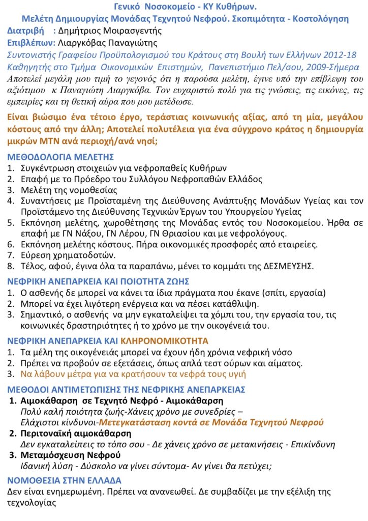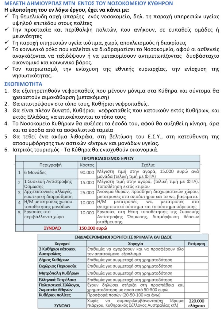 Νέα Δράση: Μελέτη Δημητρίου Μοιρασγεντή για Δημιουργία Μονάδας Τεχνητού Νεφρού στο Νοσοκομείο Κυθήρων (Συνοπτική παρουσίαση)