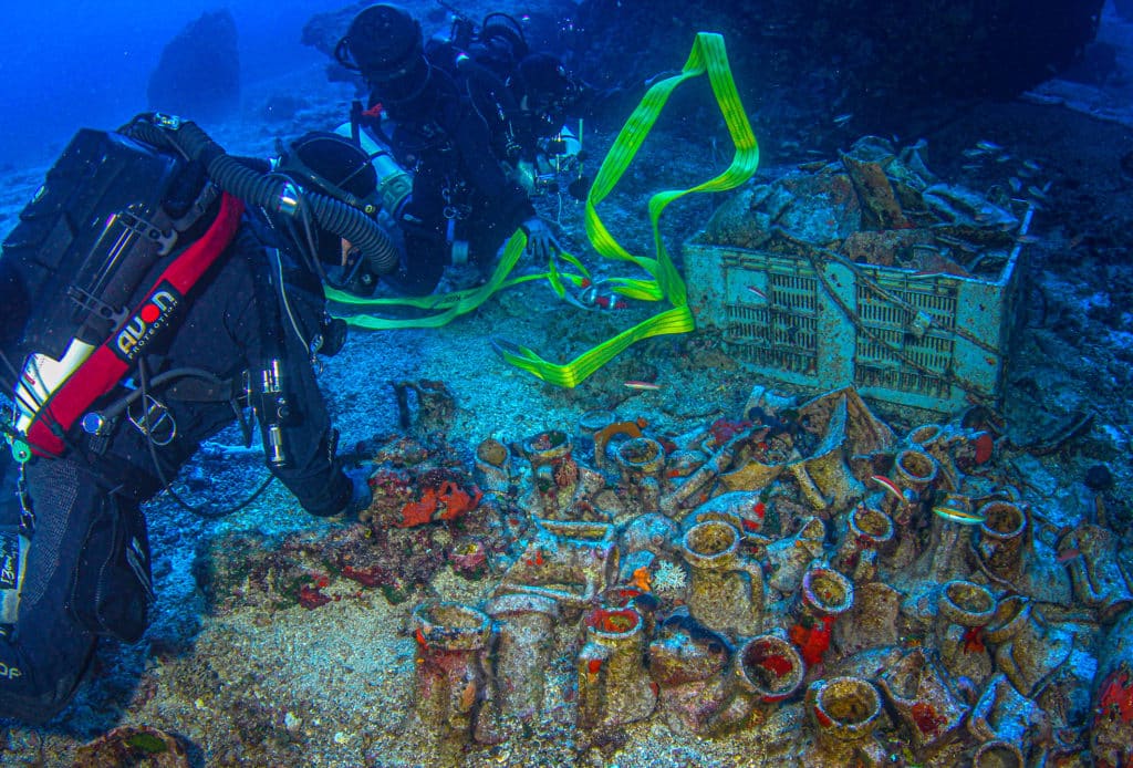 Επιπρόσθετα ανελκύστηκε πλαστικός κάλαθος διαστάσεων 110x110x45 εκατοστών, γεμάτος με τμήματα αμφορέων, βάσεις, λαιμούς και σώματα σωζόμενα από την κοιλία του αγγείου ως τη βάση.