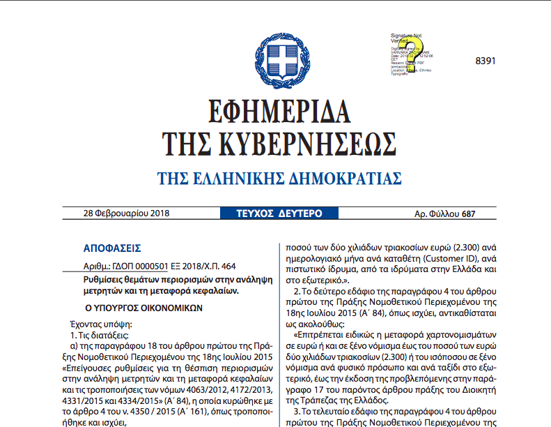 Δημοσιεύθηκε σήμερα 28 Φεβρουαρίου στην Εφημερίδα της Κυβέρνησης (ΦΕΚ 687, τεύχος Β’) η απόφαση του υπουργού Οικονομικών, σύμφωνα με την οποία τροποποιούνται οι περιορισμοί στην ανάληψη μετρητών και στη μεταφορά κεφαλαίων που θεσπίστηκαν με την Πράξη Νομοθετικού Περιεχομένου της 18ης Ιουλίου 2015(Α’ 84) όπως ισχύει.