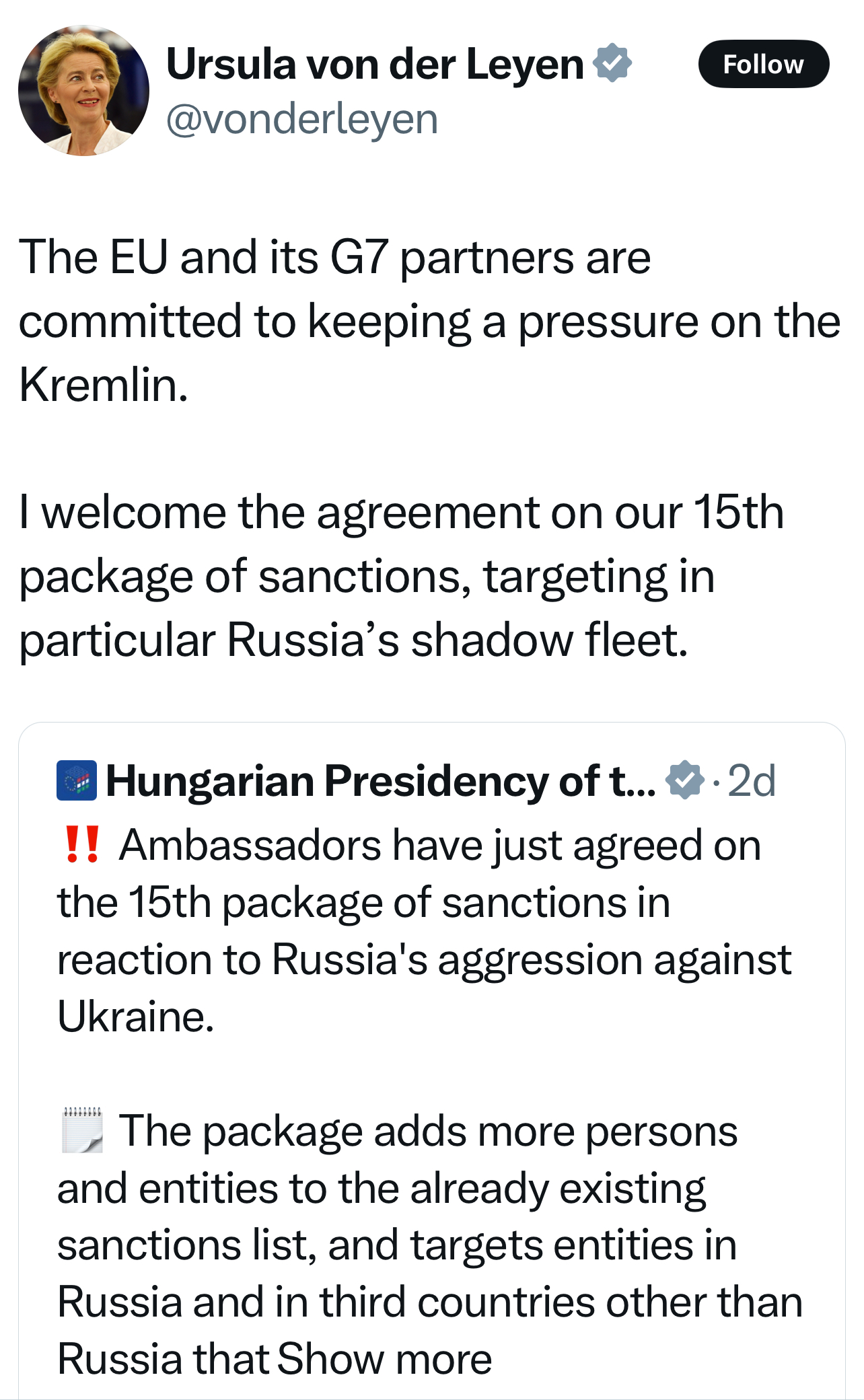 Η πρόεδρος της Επιτροπής Ούρσουλα φον ντερ Λάιεν χαιρέτισε τη συμφωνία των χωρών της ΕΕ για το 15ο πακέτο κυρώσεων κατά της Ρωσίας, λέγοντας ότι η ΕΕ και οι εταίροι της στη G7 δεσμεύονται να διατηρήσουν την πίεση προς το Κρεμλίνο.