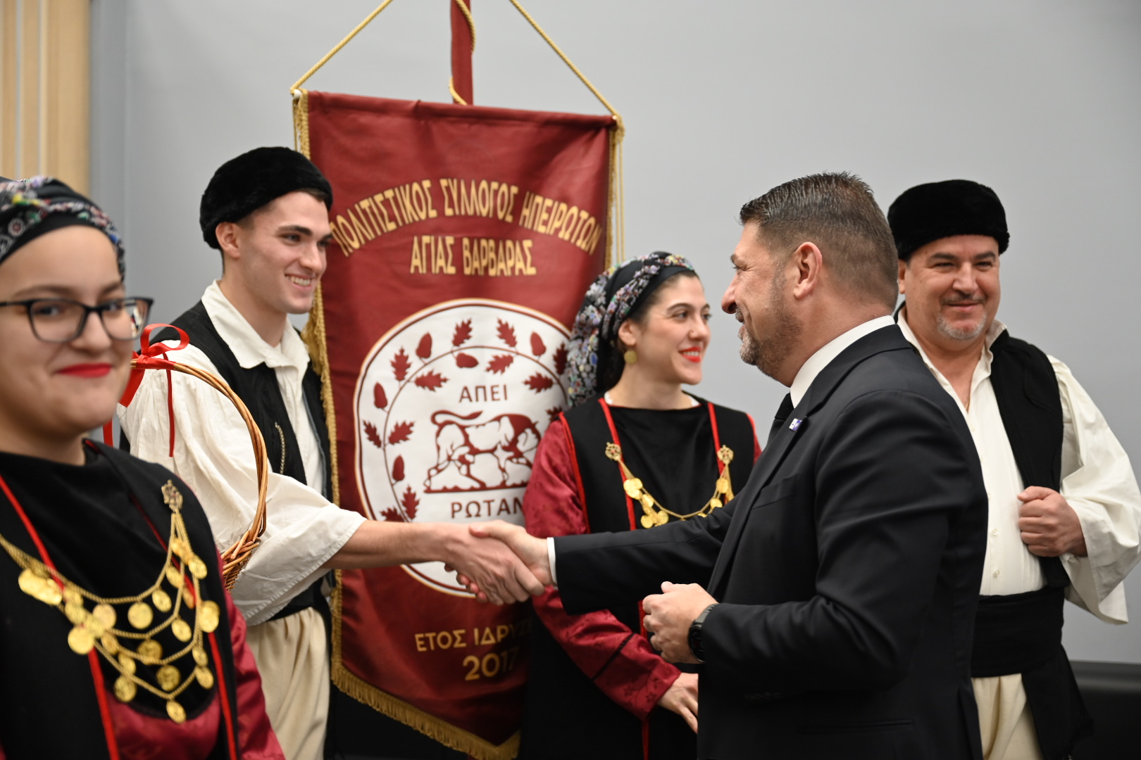 Ακολούθησαν τα μέλη του τον Πολιτιστικού Συλλόγου Ηπειρωτών Αγίας Βαρβάρας «Απειρωταν». Φορώντας τις παραδοσιακές φορεσιές τους και με τη συνοδεία του κλαρίνου, έψαλαν τα κάλαντα, τραγούδησαν ηπειρώτικα τραγούδια και χόρεψαν παραδοσιακούς χορούς, ενώ προσέφεραν στον Περιφερειάρχη ένα καλάθι με προϊόντα της Ηπειρώτικης γης.