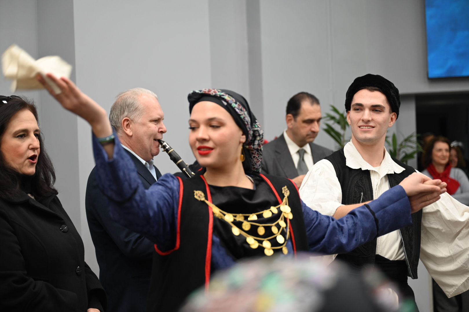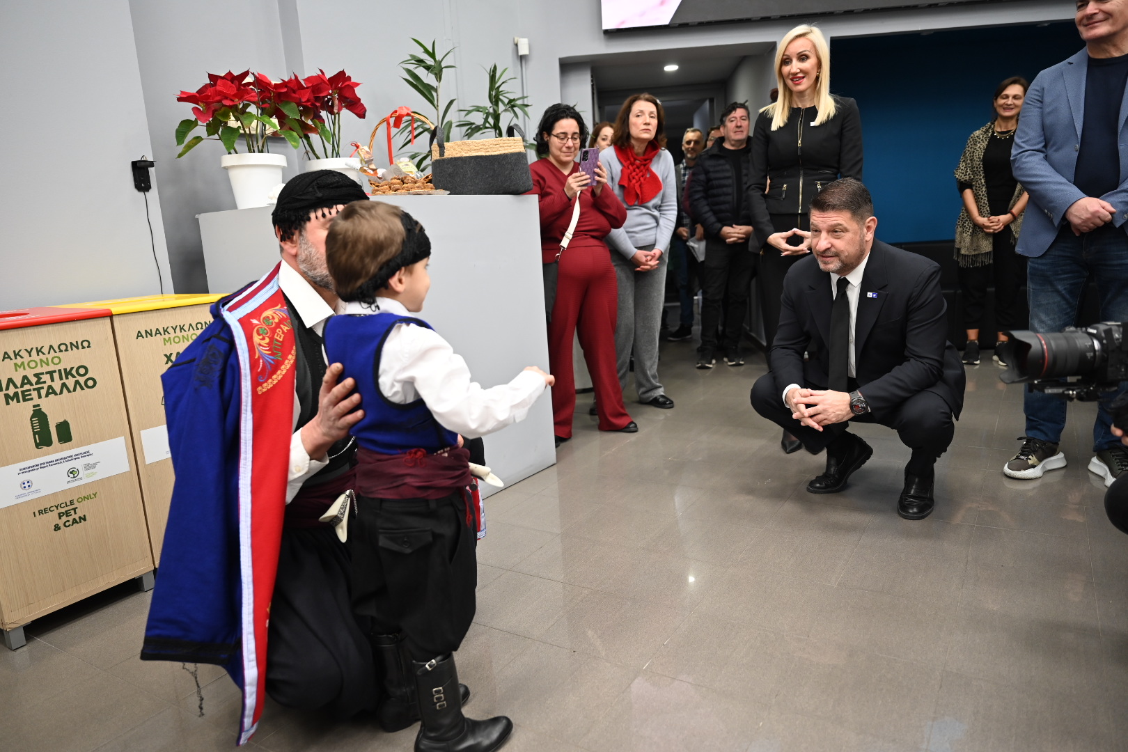 Η εορταστική ατμόσφαιρα κορυφώθηκε με τον Κρητικό Χορευτικό Σύλλογο «Απτεραίοι», από τον Κορυδαλλό, τα μέλη του οποίου είπαν τα παραδοσιακά κάλαντα της Κρήτης, συνοδεία λαούτου, βιολιού και λύρας. Μάλιστα, τρεις λιλιπούτειοι χορευτές ευχήθηκαν στον Περιφερειάρχη με μαντινάδες για τη νέα χρονιά, ενώ η διοίκηση του συλλόγου του προσέφερε ως εθιμοτυπικό δώρο μια εικόνα της Παναγίας Επτάσπαθης.