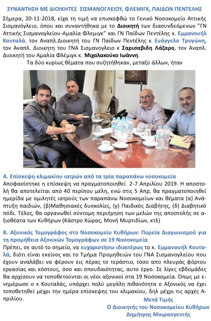Ανακοινώσεις _ Δελτία Τύπου Νοσοκομείο Κυθήρων – Συνάντηση με Διοικητές Σισμανογλείου, Φλέμιγκ, Παίδων Πεντέλης την Νοέ 20, 2018 720