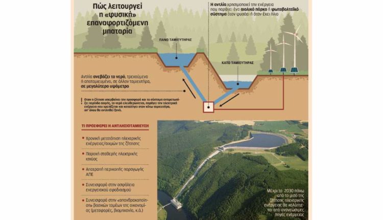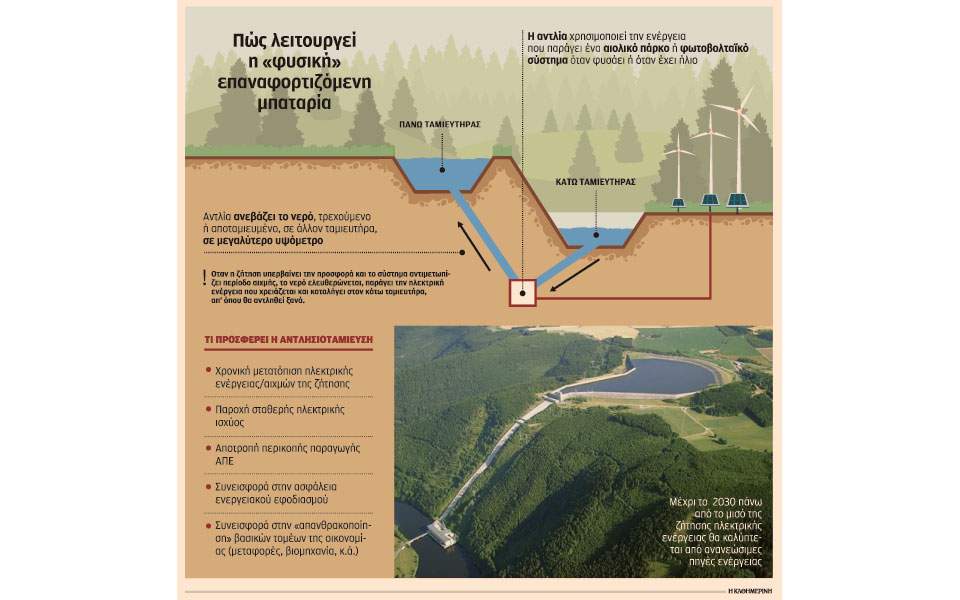 Τι είναι και τι κάνει η αντλησιοταμίευση; Μία αντλία ανεβάζει το νερό, τρεχούμενο ή αποταμιευμένο, σε έναν άλλο ταμιευτήρα, σε μεγαλύτερο υψόμετρο. Η αντλία λειτουργεί χρησιμοποιώντας συνήθως την ενέργεια που παράγει ένα αιολικό πάρκο ή φωτοβολταϊκό σύστημα όταν φυσάει ή όταν έχει ήλιο, ενώ, ταυτόχρονα, οι ανάγκες ηλεκτρικής ενέργειας του συστήματος έχουν καλυφθεί, οπότε η ανανεώσιμη ενέργεια που παράγεται θα πήγαινε χαμένη. Κατόπιν, όταν η ζήτηση υπερβαίνει την προσφορά και το σύστημα αντιμετωπίζει περίοδο αιχμής, το νερό ελευθερώνεται, παράγει την ηλεκτρική ενέργεια που χρειάζεται και καταλήγει στον κάτω ταμιευτήρα, αναμένοντας να αντληθεί ξανά. Πρόκειται δηλαδή για μια «φυσική» επαναφορτιζόμενη μπαταρία.