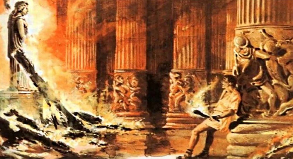 Στις 21 Ιουλίου του 356 π.Χ. ο Ηρόστρατος, τυφλωμένος από την καταστροφική του μανία για δόξα, πυρπολεί το ναό της Αρτέμιδας. Η φωτιά είναι τόσο μεγάλη που κυριολεκτικά αφήνει πίσω της μόνο στάχτη.