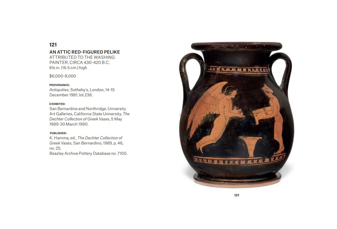 Έτσι κι εδώ. Ένας ρωμαϊκός αετός και ένας πήλινος λαγός (που στο αρχείο Μπεκίνα εμφανίζεται με σπασμένα αυτιά, ενώ στον κατάλογο των Κρίστις εμφανιζόταν, προτού αποσυρθεί, αποκατεστημένος και λαμπερός), του 2ου – 3ου μ.Χ. αιώνα και δύο αττικά αγγεία του 5ου αιώνα π.Χ., μία κύλικα του 6ου π.Χ. αιώνα και μια πελίκη του 5ου π.Χ. αιώνα είχαν «ιστορικό». Και ιστορία, ειδικά τα ελληνικά αγγεία που έφτασαν στην Ιταλία, όπως φαίνεται, μέσα από δρόμους εμπορικούς, των Ετρούσκων και των Ελλήνων της Κάτω Ιταλίας.