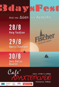 Τις επόμενες ημέρες θα εμφανιστούν οι Opera Chaotique, οι οποίοι μετά από εμφανίσεις σε 16 χώρες και με σημαντικές συνεργασίες, θα παρουσιάσουν ένα σουρεαλιστικό καλοκαιρινό show, με όλα τα συνθετικά που τους έχουν καθιερώσει στη διεθνή σκηνή ως ένα πρωτοποριακό σχήμα: χιούμορ, εφευρετικές διασκευές γνωστών τραγουδιών, πρωτότυπη δική τους μουσική, αλληλεπίδραση με το κοινό και μια ιδιαίτερη καλλιτεχνική ματιά που μόνο στις ζωντανές τους εμφανίσεις μπορεί κάποιος να ζήσει.