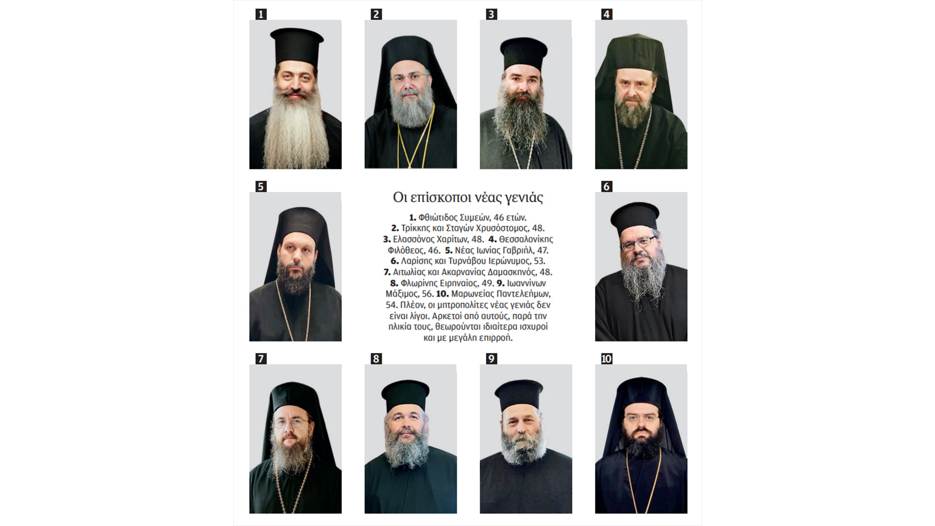 Πλέον, οι μητροπολίτες νέας γενιάς δεν είναι λίγοι. Αρκετοί από αυτούς, παρά την ηλικία τους, θεωρούνται ιδιαίτερα ισχυροί και με μεγάλη επιρροή. Ο 46χρονος Θεσσαλονίκης Φιλόθεος είναι η τελευταία προσθήκη στην ομάδα μητροπολιτών κάτω των 50 ετών. Ο συνομήλικός του Φθιώτιδος Συμεών, οι 48χρονοι Τρίκκης και Σταγών Χρυσόστομος, Ελασσόνος Χαρίτων, Αιτωλίας και Ακαρνανίας Δαμασκηνός, ο 47χρονος Νέας Ιωνίας Γαβριήλ, ο 49χρονος Φλωρίνης Ειρηναίος συμπληρώνουν αυτή την ομάδα, ενώ λίγο μεγαλύτεροι είναι ο 53χρονος Λαρίσης και Τυρνάβου Ιερώνυμος, ο 54χρονος Μαρωνείας Παντελεήμων, ο 56χρονος Ιωαννίνων Μάξιμος.