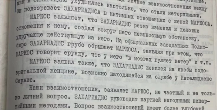 «Ένα ενδιαφέρον απόσπασμα των σχέσεων στο εσωτερικό του κομμουνιστικού μπλοκ. Ένας από τους Έλληνες ηγέτες των κομμουνιστών (Μάρκος Βαφειάδης) κατηγορεί τον άλλον (Ζαχαριάδη) πως είχε στενές σχέσεις με τη γυναίκα του -και κάνει την αποκάλυψη σε μια συνάντηση με τους Σοβιετικούς ηγέτες, σε μια προφανή προσπάθεια να τους κάνει να παρέμβουν».