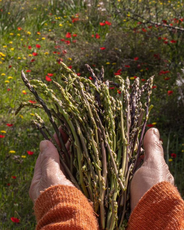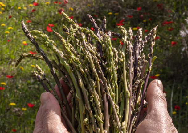 Ξεμυτίζουν γύρω από το σπίτι μου, στα χέρσα χωράφια, στις πλαγιές των λόφων και τους όχτους γύρω από τη ρεματιά, μπλεγμένα μέσα στα μυτερά αγκάθια τους. Σε ξεγελά ο λεπτότατος πρασινομόβ βλαστός τους, μπορεί να περάσεις ξυστά δίπλα τους και να μην τον πάρεις είδηση, μαγικά αόρατος. Τι ενθουσιασμός όμως αν τον δεις εγκαίρως και κόψεις το ζουμερό βλαστάρι του σπαραγγιού, ακριβώς στο σημείο που σπάει όταν λυγίσει απαλά.