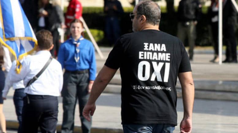 Δεν ξέρω τι διδάσκει ο κύριος που έκρινε σκόπιμο να επιδείξει στην παρέλαση των μαθητών του τον ανέξοδο ηρωισμό του – «τζάμπα μαγκιά» εις την απλοελληνικήν. Πάντως, με το μαύρο φανελάκι που από τη μία έγραφε «Είπαμε Οχι» και από την άλλη «Ξαναείπαμε Οχι», προβίβασε εαυτόν σε πρότυπο αυτής της τάξης των συμπολιτών μας που αποκαλούνται «Ελληναράδες». Οπου χαρακτηριστικόν του «Ελληναρά» είναι ότι, επειδή μπορεί να φωνασκεί, να καπνίζει εκεί όπου απαγορεύεται και να περνάει με κόκκινο ατιμωρητί, θεωρεί ότι ενσαρκώνει κάποιου είδους ελληνικό πνεύμα το οποίο ταυτίζει με το θράσος, την αγένεια και την κακοτροπία.