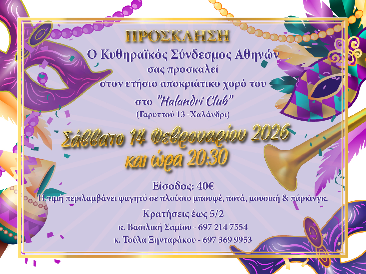 Ο ΚΥΘΗΡΑΪΚΟΣ ΣΥΝΔΕΣΜΟΣ ΑΘΗΝΩΝ ΣΑΣ ΠΕΡΙΜΕΝΕΙ ΣΤΟΝ ΕΤΗΣΙΟ ΧΟΡΟ ΤΟΥ ΓΙΑ ΜΙΑ ΞΕΧΩΡΙΣΤΗ ΒΡΑΔΙΑ