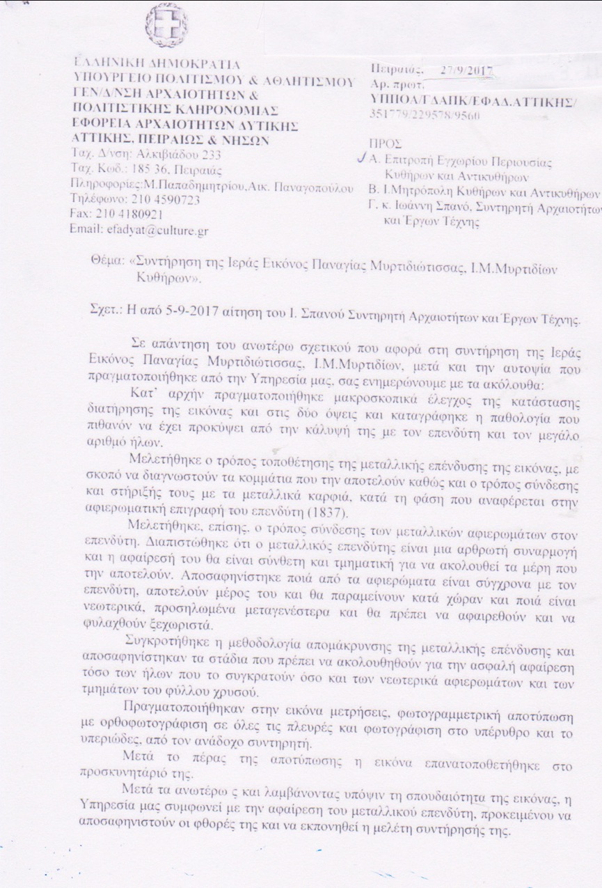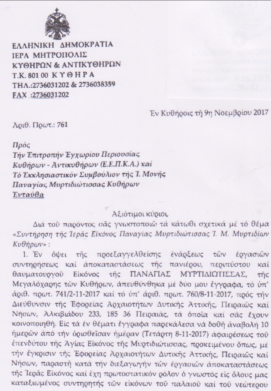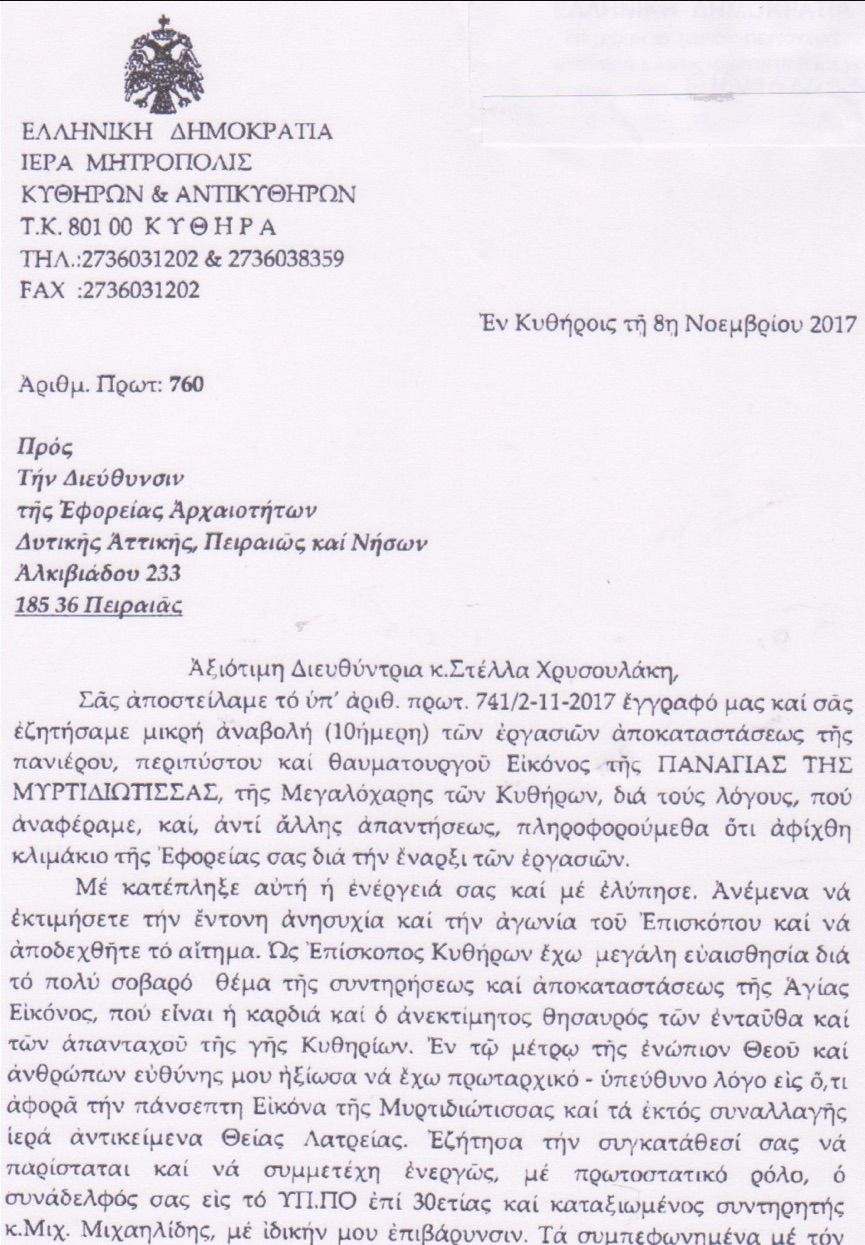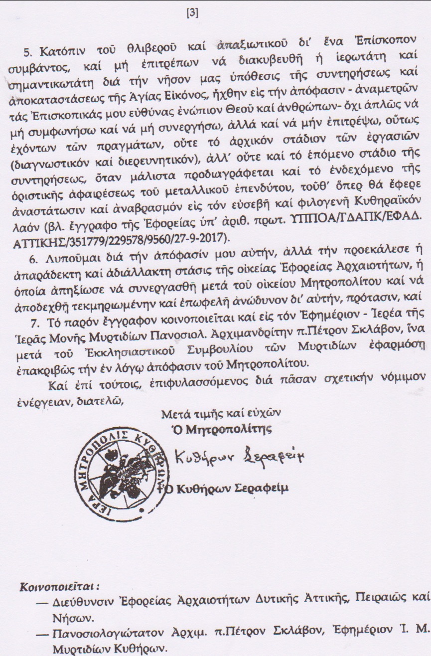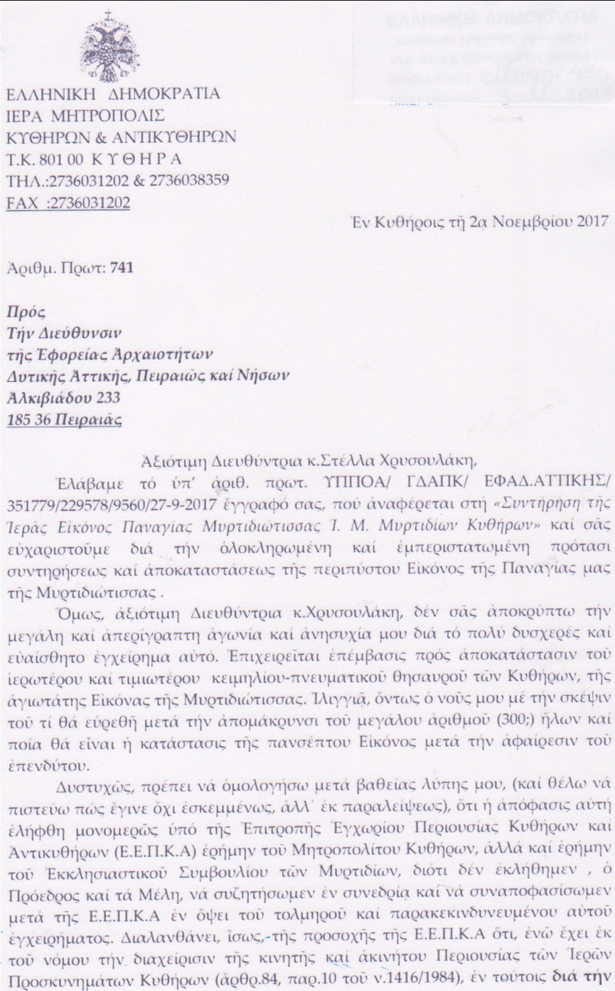 Στις 2 Νοεμβρίου 2017 εστάλη από το Μητροπολίτη Κυθήρων κκ Σεραφείμ έγγραφο προς τη διευθύντρια της Αρχαιολογικής Υπηρεσίας, στο οποίο τόνιζε ότι η Επιτροπή έλαβε την απόφαση χωρίς να ενημερώσει το Εκκλησιαστικό Συμβούλιο και τον ίδιο, ζητούσε, λόγω της σοβαρότητος του θέματος 10ήμερο αναβολή και πρότεινε να γίνει η επίβλεψη της συντήρησης αυτής από άλλον συντηρητή ή υπό την επίβλεψή του, τον οποίο και κατονόμαζε. Από την υπηρεσία δεν δόθηκε απάντηση (ή τουλάχιστον εμείς δεν γνωρίζουμε κάτι τέτοιο) με αποτέλεσμα να ακολουθήσει νέα επιστολή στις 8 Νοεμβρίου και ενώ το κλιμάκιο της Αρχαιολογικής ήταν ήδη στα Κύθηρα για να γίνει πραγματογνωμοσύνη και να ακολουθήσουν οι προτάσεις των ειδικών για τον τρόπο της συντήρησης. Στη νέα αυτή επιστολή ο Μητροπολίτης επανελάμβανε τους φόβους και τις επιφυλάξεις του, ζητούσε και πάλι αναβολή και πρότεινε για μία ακόμη φορά να συμμετάσχει στην όλη διαδικασία ο προτεινόμενος συντηρητής. Την επομένη, 9 Νοεμβρίου, ο Μητροπολίτης αποστέλλει νέα επιστολή στην οποία τονίζει τα εξής: