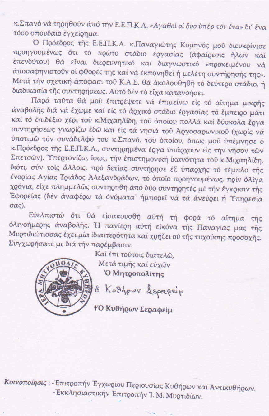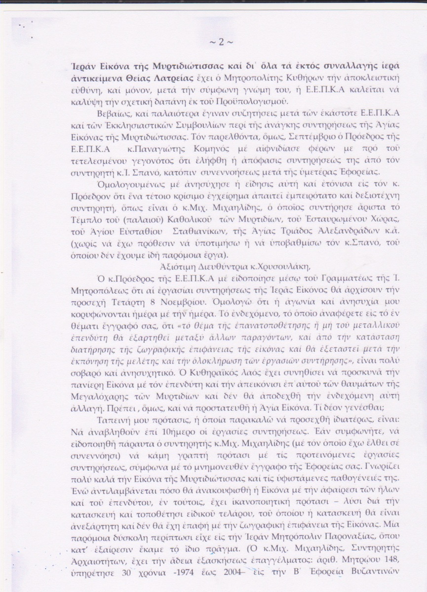 2. Μετά τήν συζήτησι αὐτή καί τήν ἔνταξι στόν Προϋπολογισμό, καί χωρίς νά μεσολαβήση τίποτε ἄλλο, ἐνημερώθηκα πρό τῆς Ἱερᾶς Πανηγύρεως τῆς Μυρτιδιώτισσάς μας ἀπό τόν Πρόεδρο τῆς Ἐγχωρίου κ.Παν. Κομηνό ὅτι ἐπίκειται ἡ συντήρησις τῆς Εἰκόνος καί ὅτι ἀνετέθη ἡ ἐργασία στόν συντηρητή κ. Ἰωαν. Σπανό. (Ἐκ τῶν ὑστέρων ἀντελήφθην ὅτι ἦταν τό πρόσωπο, πού εἴχαμε πρό 20ετίας συνεργασθῆ στίς Σπέτσες γιά τήν συντήρησι ἱερῶν κειμηλίων). Τό γεγονός αὐτό μέ ἐξένισε, διότι εὑρέθην πρό εἰλημμένης ἀποφάσεως, ἐνῶ ὄχι τόσο ὡς Πρόεδρος τοῦ Ἐκκλησιαστικοῦ Συμβουλίου, ἀλλ’ ὡς ὁ Μητροπολίτης Κυθήρων ἔχω τήν πρώτη καί κύρια εὐθύνη σέ ἱερά ἀντικείμενα, πού θεωροῦνται «ἐκτός συναλλαγῆς». Φάνηκε ἡ δυσφορία μου γιά τήν ἐπιλογή ἑνός προσώπου – συντηρητοῦ, τοῦ ὁποίου δέν εἴχαμε «δείγματα γραφῆς», χωρίς νά πάει ὁ νοῦς μου ὅτι ἦταν τό πρόσωπο, πού παλαιότερα εἴχαμε συνεργασθῆ (ἄν καί ἡ περίπτωσις τῆς συντηρήσεως τῆς Ἁγίας Εἰκόνος τῆς Μυρτιδιώτισσας εἶναι ἰδιάζουσα καί πολύ διαφορετική), ἀλλά δέν ἀντέδρασα ἐκείνη τήν στιγμή, ἀφοῦ βρέθηκα πρό τετελεσμένης διαδικασίας. Ὅμως, καθώς πλησίαζε ὁ καιρός μέ «ἔτρωγε» κυριολεκτικά ἡ ἀγωνία καί ἀνησυχία.