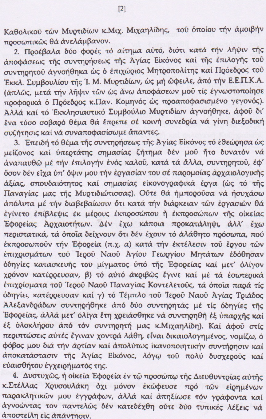 6. Ἔχοντας ὑπ’ ὄψιν μου ὅλα τά ἀνωτέρω παρακάλεσα θερμά -δέν πρόβαλα τήν ἀξίωσι- μέ τά δύο πρῶτα μου ἔγγραφα νά δοθῆ παράτασις 10 ἡμερῶν (ἀφοῦ εἶχα συνεννοηθῆ προηγουμένως μέ τόν λίαν ἔμπειρο συντηρητή μας κ.Μιχαηλίδη) γιά νά παρευρεθῆ -μέ τήν συγκατάθεσι τῆς Ἐφορείας Ἀρχαιοτήτων– καί νά ἔχη, κατ’ ἐξαίρεσιν στήν περίπτωσι αὐτή, λόγῳ ἀρχαιότητος καί προϋπηρεσίας στή Μονή τῶν Μυρτιδίων, πρωτοστατικό ρόλο κατά τήν διεξαγωγή τῶν ἐργασιῶν συντηρήσεως. Αὐτό ἴσως θεωρηθῆ ὡς ἀντιδεοντολογικό. Δέν ἦταν, ὅμως, ἀντιδεοντολογικό τό ὅτι, ἐνῶ εἰς τό παρελθόν, ὅταν γίνονταν τά ἔργα εἰς τό Καθολικόν (ἄνω καί κάτω) τῆς Μονῆς καί τό Ἐκκλησιαστικό Μουσεῖο της εἶχε ἐνημέρωσιν καί λόγον ὁ Μητροπολίτης, ἐδῶ στό πιό σημαντικό ἔργο δέν ἐρωτήθηκε κἄν;