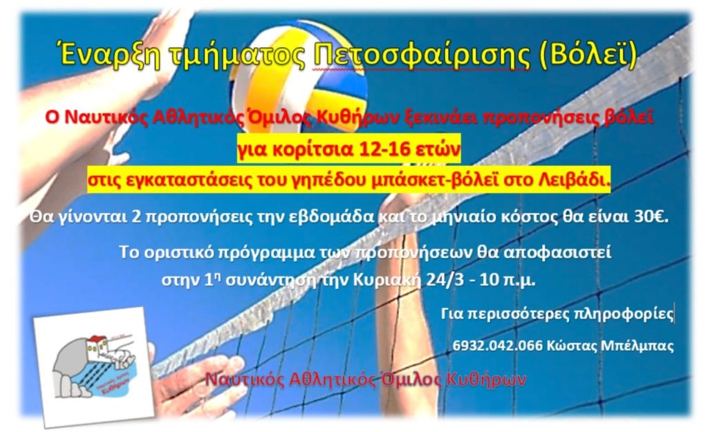 - Ο ΝΑΟΚ Κυθήρων ξεκινάει τμήμα προπονήσεων Πετοσφαίρισης (βόλεϊ) για κορίτσια 12-16 ετών