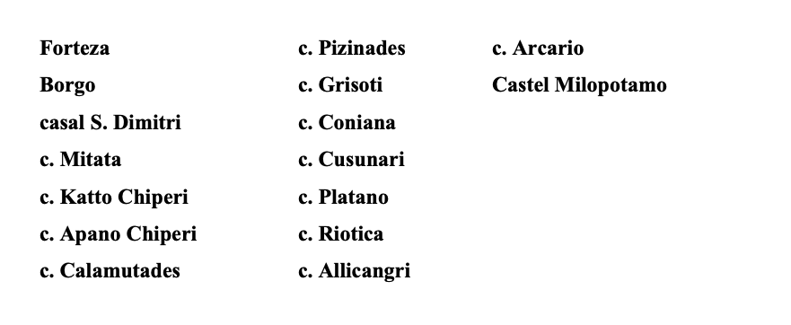 Στη συνέχεια θα προσπαθήσουμε να συμβάλουμε στην ερμηνεία του γρίφου της απογραφής αυτής βασιζόμενοι στο κείμενο που αναφέρει η καθηγήτρια Χρ. Μαλτέζου, καθώς, αυτό είναι το κείμενο το οποίο βρίσκεται στη Μαρκιανή Βιβλιοθήκη της Βενετίας, του οποίου μάλιστα φωτοτυπία δημοσίευσε η ίδια σε μεταγενέστερο έργο της[3]. Για να διευκολυνθεί η προσέγγιση που θα επιχειρήσουμε είναι απαραίτητο να παρουσιασθεί το πρωτότυπο κείμενο, όπως δημοσιεύεται από την καθηγήτρια Χρ. Μαλτέζου. Παρακάτω αναφέρονται με τη σειρά του πρωτοτύπου τα χωριά της απογραφής, όπως εμφανίζονται στο έγγραφο της Μαρκιανής Βιβλιοθήκης.