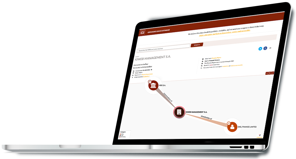 Όταν δημοσιεύθηκαν τα στοιχεία της πρώτης διαρροής των Panama Papers, τον Μάιο του 2016, στην βάση δεδομένων του ICIJ (offshoreleaks.icij.org) η Kiweb εμφανιζόταν να συνδέεται με ένα ελβετικό γραφείο-μεσάζοντα, την HBS SA και με έναν μέτοχο, την offshore εταιρεία Exel Finance Limited, με έδρα επίσης στις Βρετανικές Παρθένους Νήσους. Η Exel χρησιμοποιείτο από τον ελβετό μεσάζοντα ως μέτοχος σε τουλάχιστον 17 ακόμη offshore εταιρείες. Πουθενά στην πρώτη διαρροή δεν εμφανιζόταν κάποιο φυσικό πρόσωπο να συνδέεται με την Kiweb.