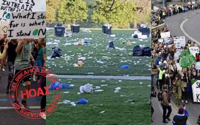 Μια εικόνα με εκατοντάδες κοινοποιήσεις που κυκλοφορεί στο Facebook, συνοδεύεται από τον ισχυρισμό «Έτσι άφησαν το χώρο, αυτοί που διαδήλωσαν υπέρ του πλανήτη….»