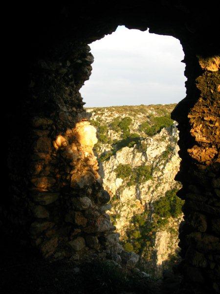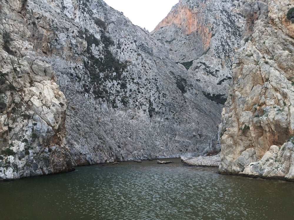 Κάθετος γκρεμός, σαν κομμένος με μαχαίρι εκατό και πλέον μέτρα ύψος, δεξιά κι’ αριστερά πάνω απ’ τα κεφάλια μας! Και το πιο σπουδαίο! Ενώ είναι σκέτος βράχος, στο μεγαλύτερο μέρος του είναι σκεπασμένος με μια απαλή, σε ανοιχτόχρωμο πράσινο, βλάστηση! Εκεί πάνω στον ξερό βράχο! Χωρίς ίχνος χώματος.