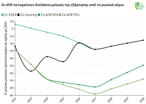 Το σενάριο επιστροφής στον λιγνίτη εξοικονομεί περισσότερο ρωσικό ορυκτό αέριο σε σχέση με το ΕΣΕΚ αλλά πολύ λιγότερο σε σύγκριση με τα δύο σενάρια που επιτυγχάνουν διείσδυση ΑΠΕ το 2030 κατά 70% και 75% αντίστοιχα. Αθροιστικά για την τετραετία 2022-2025 το σενάριο που βασίζεται στον λιγνίτη μειώνει την εξάρτηση από το ρωσικό αέριο κατά 40,7%, ενώ τα δύο σενάρια που βασίζονται στις ΑΠΕ επιτυγχάνουν εξοικονόμηση σε σχέση με τις ανάγκες ρωσικού αερίου το 2021 κατά 54,3% (Σ3-ΑΠΕ70) και 55,1% (Σ4-ΑΠΕ75), αντίστοιχα, με την προϋπόθεση ότι εγκαθίσταται από 1 GW νέας ισχύος αιολικών και φωτοβολταϊκών ανά έτος την τριετία 2022-2024.