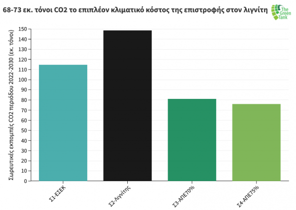 Με διατήρηση των σημερινών επιπέδων τιμών CO2 στο χρηματιστήριο ρύπων ως το 2030 (μια συντηρητική ενδεχομένως εκτίμηση), το σενάριο επιστροφής στον λιγνίτη θα επιβαρύνει το κόστος λειτουργίας του συστήματος ηλεκτροπαραγωγής της χώρας με περίπου € 5,4 δις και € 5,8 δις, επιπλέον του κόστους CO2 των δύο σεναρίων διείσδυσης ΑΠΕ το 2030 κατά 70% και 75%, αντίστοιχα.