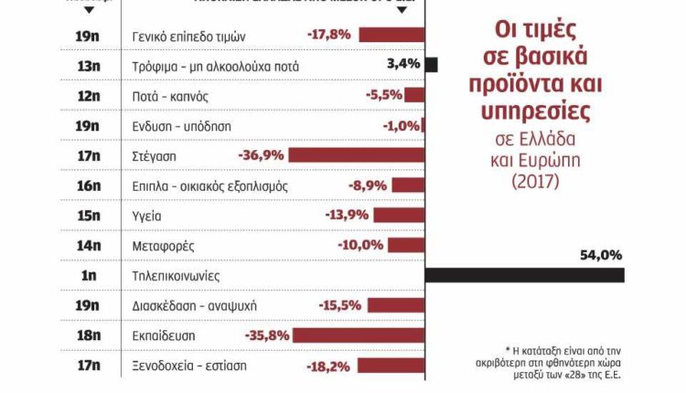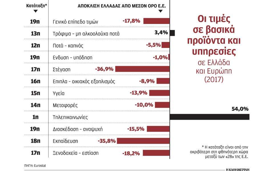 Η ομάδα προϊόντων βάσει της οποίας η Ελλάδα είναι η ακριβότερη μεταξύ των «28» με τις τιμές να αποκλίνουν από τον μέσο κοινοτικό όρο κατά 54%, είναι οι τηλεπικοινωνίες (περιλαμβάνει χρεώσεις τηλεφωνίας, ταχυδρομικά τέλη, αλλά και τις συσκευές τηλεφώνων). Στον αντίποδα βρίσκονται οι κατηγορίες «Στέγαση» και «Εκπαίδευση», με τις τιμές στην Ελλάδα να βρίσκονται το 2017 κάτω από τον μέσο κοινοτικό όρο κατά 36,9% και 35,8%, αντιστοίχως. Σε ό,τι αφορά ειδικά τη στέγαση, τα στοιχεία της Eurostat δείχνουν στην πραγματικότητα τη μισή αλήθεια. Το χαμηλό επίπεδο τιμών οφείλεται στο γεγονός ότι τα ενοίκια συγκριτικά με τη Δυτική Ευρώπη είναι χαμηλά, ενώ κατά την περίοδο της κρίσης υποχώρησαν σημαντικά. Δεν ισχύει όμως το ίδιο με τις τιμές για παράδειγμα της ηλεκτρικής ενέργειας ή του πετρελαίου θέρμανσης, που επίσης περιλαμβάνονται στις δαπάνες στέγασης, ενώ φυσικά δεν συγκαταλέγονται άλλοι παράγοντες κόστους, όπως είναι για παράδειγμα ο ΕΝΦΙΑ.