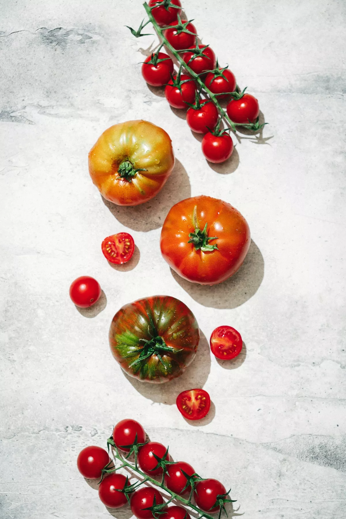 Και δεν σταματάμε εδώ. Υπάρχει και η ντομάτα σε σχήμα καμπάνας (όπως η πολύ γλυκιά Καρδιά του Βοδιού), η Μαύρη Μεγάλη από την Ουκρανία, που κρατάει το σχήμα της και κάνει για γεμιστά, η Μπατάλα Βραυρώνας, η χυμώδης Καρδιά του Βούβαλου με προέλευση από τη νότια Ιταλία και τη Γαλλία, τα Βελανίδια, η Ροζέ Κρήτης με προέλευση από τη Βουλγαρία, το πασίγνωστο ξερικό ντοματάκι Σαντορίνης ΠΟΠ, το υβρίδιο Merlice και το υβρίδιο Ekstasis, που πωλούνται παντού, η κακομούτσουνη, κρεατωμένη Μπατάλα Βραυρώνα», τα χρωματιστά ντοματίνια, ανάμεσά τους και το ρωσικής προέλευσης Μαύρο Δαμάσκηνο, με σκληρούτσικη φλούδα, τα επίσης σκληρόφλουδα, μακρουλά και τραγανά Πομοντόρια, και πολλές πολλές άλλες.