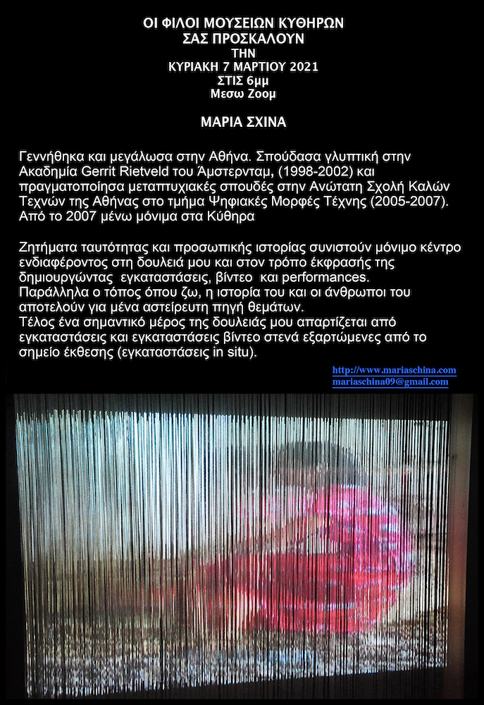 Οι Φίλοι Μουσείων Κυθήρων σας προσκαλούν στην παρουσίαση του έργου της εικαστικού ΜΑΡΙΑΣ ΣΧΙΝΑ