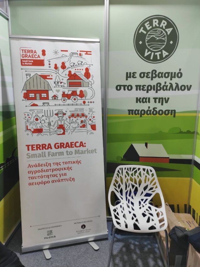 Μέσω της συμμετοχής της Περιφέρειας Βορείου Αιγαίου, το MedINA παρουσίασε -σε δικό του περίπτερο- τα πιστοποιημένα προϊόντα Ποριάζη & Σταφύλη και το ελαιόλαδο του Αγροτικού Συνεταιρισμού Λιβαδίου Κυθήρων, στο πλαίσιο προώθησής τους, υποστηρίζοντας τους παραγωγούς και προάγοντας τις αειφόρες καλλιεργητικές μεθόδους, με σεβασμό στη φύση και στην αγροδιατροφική μας κληρονομιά. Το θέμα της φετινής έκθεσης ήταν η Μεσογειακή διατροφή, την οποία επιχειρεί να διαφυλάξει η πιστοποίηση Terra Vita, όχι μόνο προωθώντας γνήσια παραδοσιακά προϊόντα, αλλά ενισχύοντας ταυτόχρονα τον αυθεντικό και αειφόρο τρόπο παραγωγής και μεταποίησής τους.