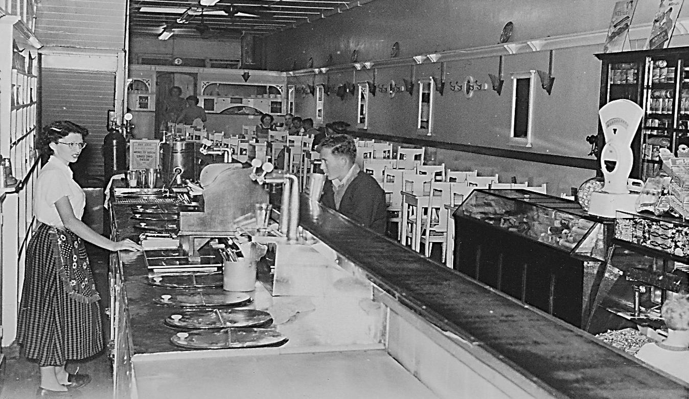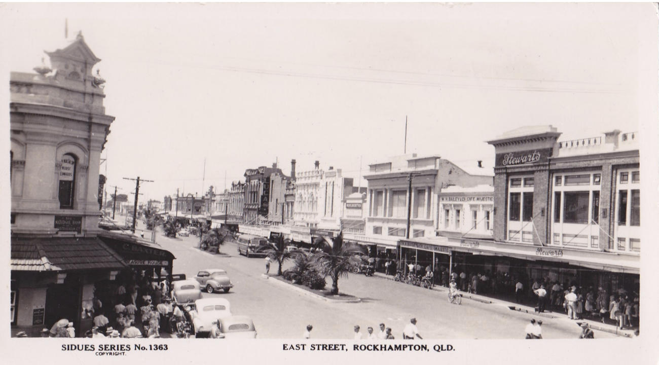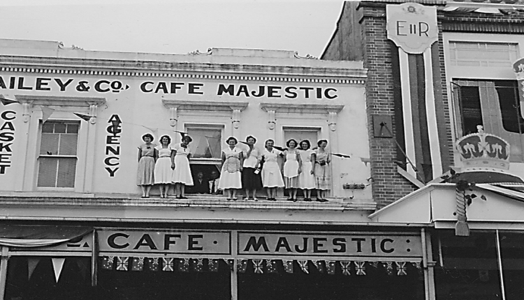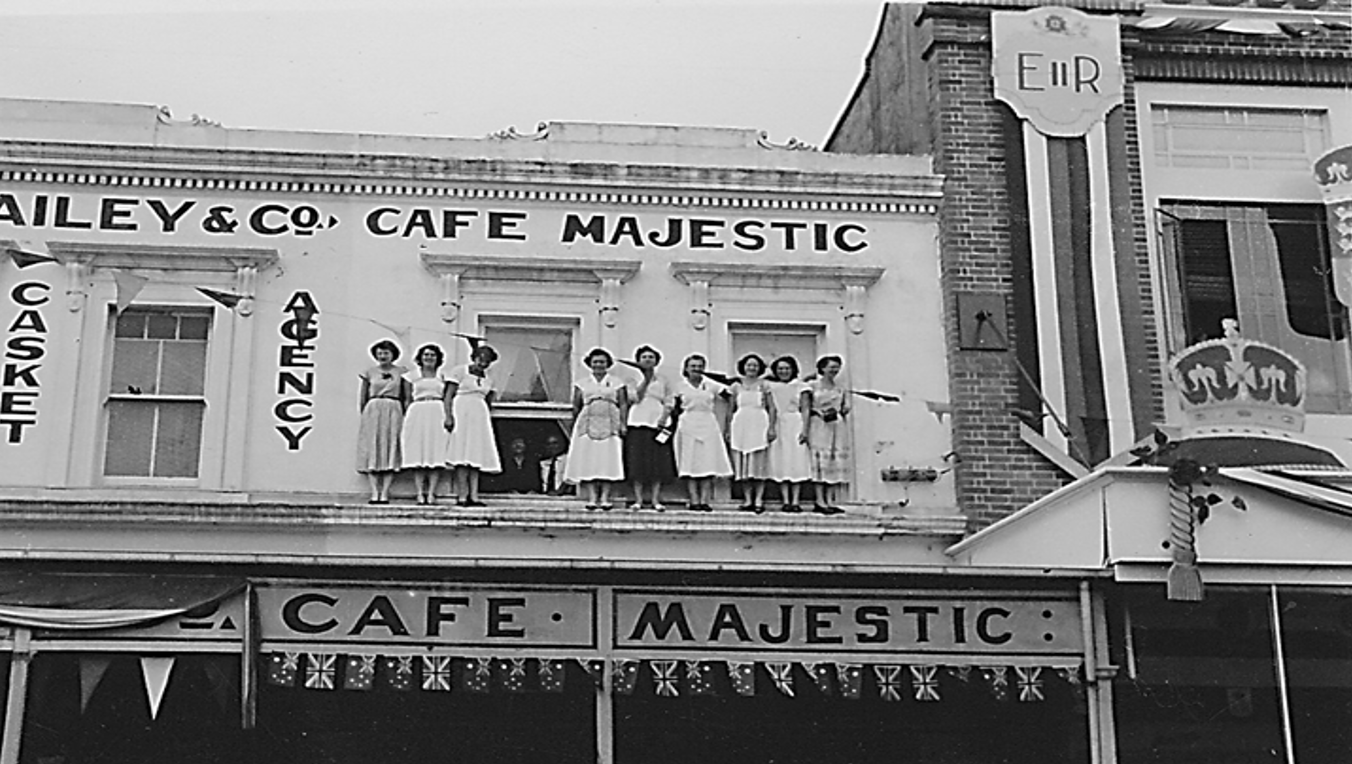 Εξωτερική όψη του Majestic Café, 15 Μαρτίου 1954, κατά την ημέρα επίσκεψης της Βασίλισσας Ελισάβετ Β’ στο Rockhampton στο πλαίσιο της περιοδείας της στην Αυστραλία. Στο παράθυρο διακρίνεται ο Παναγιώτης Λαζαρέτος.