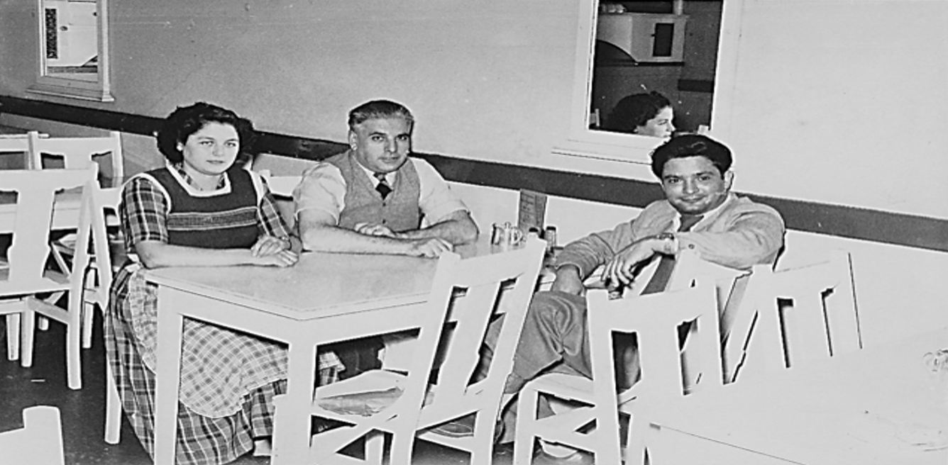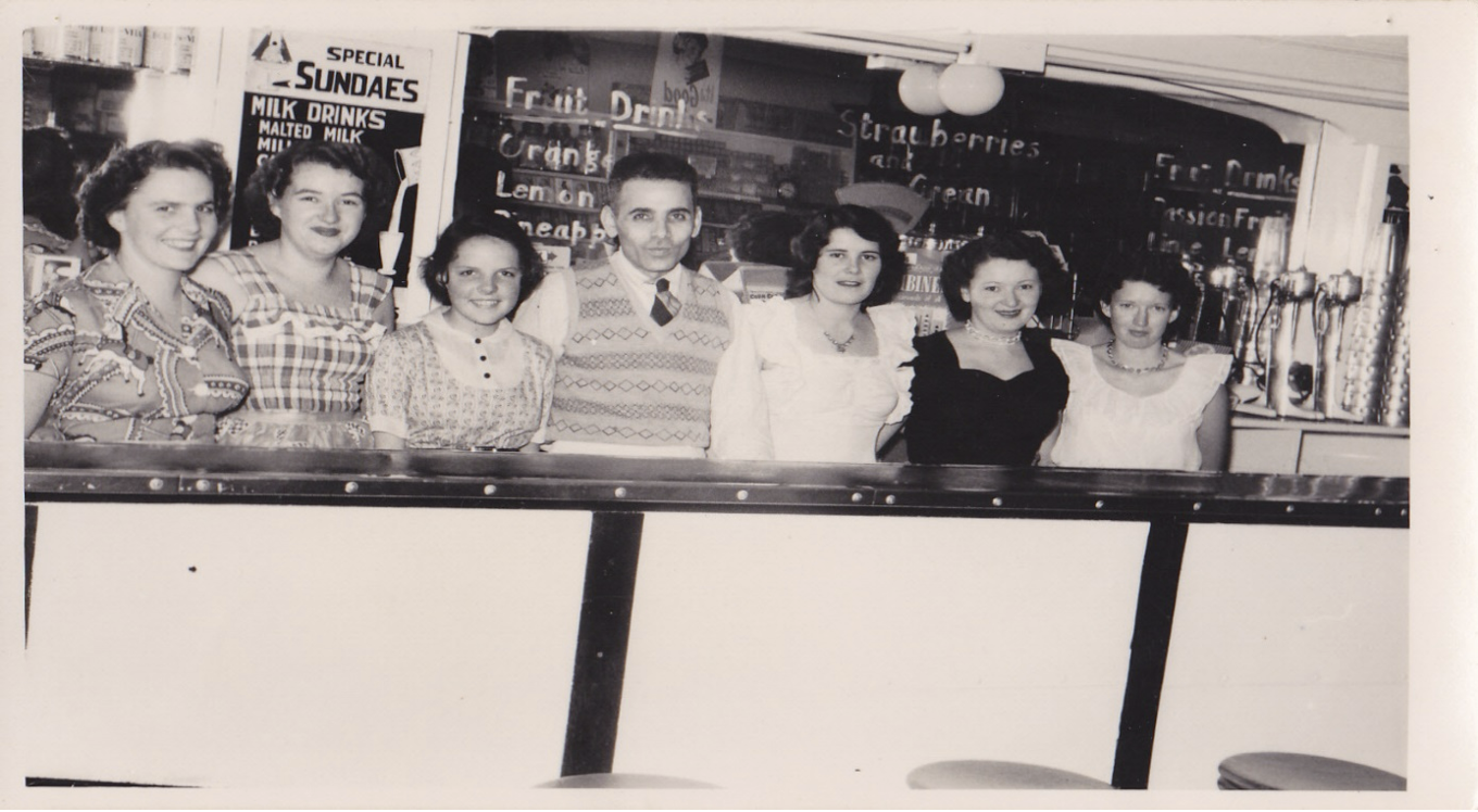 O Μηνάς Λαζαρέτος εντός του café με κοπέλες του προσωπικού, τέλη δεκαετίας του 1940.