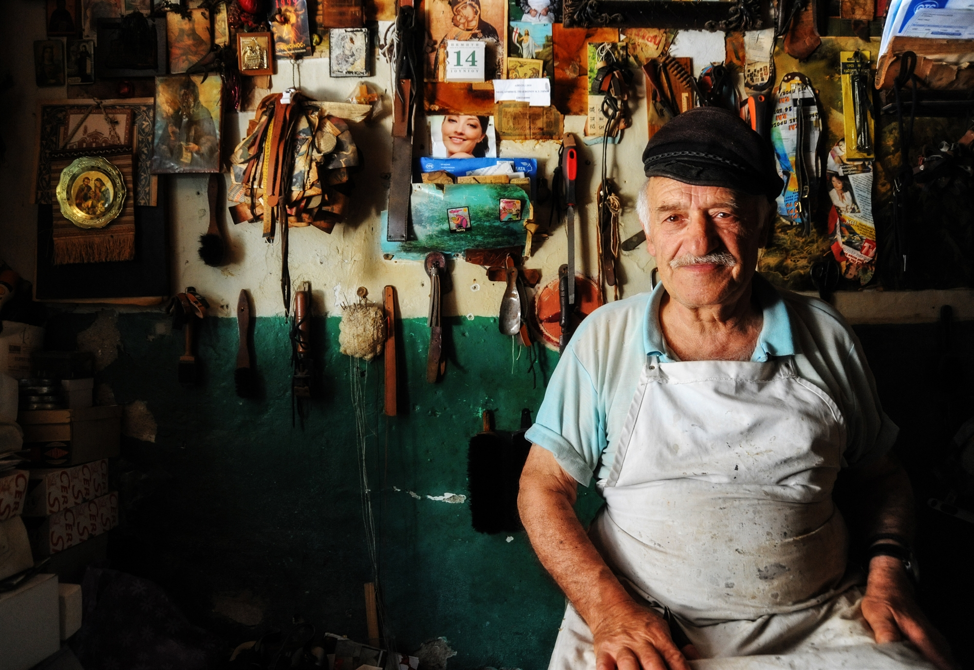 «Το 2013 ξεκίνησα μια συνεργασία με το protagon, και αναζητώντας θέματα στο νησί άρχισαν να μου τραβούν την προσοχή όλοι όσοι έκαναν παραδοσιακά επαγγέλματα, όσες και όσοι ακόμα δούλευαν με τα χέρια τους με τους παλιούς τρόπους», μας λέει η Εβελυν Φωσκόλου. «Προέκυψε έτσι το πρώτο πορτρέτο, αυτό του τσαγκάρη Αχιλλέα Χριστοφόρου. Μετά ήρθε ο σιδεράς, ο Κωνσταντίνος Αλεξόπουλος, που τώρα είναι στο γηροκομείο. Είναι ακριβώς εκατό ετών και έτσι δεν υπάρχει πια παραδοσιακός σιδεράς στο νησί». Για τη φωτογράφο, ο Αχιλλέας Χριστοφόρου, «ο τελευταίος τσαγκάρης», όπως αναφέρεται στην έκδοση, αποτελεί παιδικό βίωμα. «Mε έστελνε η μητέρα μου εκεί για να επισκευάσουμε παπούτσια και θυμάμαι να με υποβάλλει η ατμόσφαιρα του χώρου του, οι αφίσες παντού τριγύρω, η μυρωδιά της βαφής “Camel”… Οταν τον επισκέφθηκα ξανά, πριν από περίπου έντεκα χρόνια, για τη φωτογράφιση, κατέβηκα τις σκάλες του μικροσκοπικού του υπόγειου και νόμιζα πως πάτησα τα πόδια μου στη δεκαετία του ’60. Δυστυχώς, ο Αχιλλέας δεν ζει πια, πέθανε δέκα χρόνια πριν, και μαζί του πέθανε και το επάγγελμα του τσαγκάρη στο νησί».