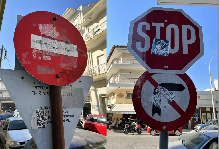 Από την άλλη πλευρά, δεν ξέρουμε τι να πρωτοπιστέψουμε. Τις πινακίδες που προειδοποιούν με φυλάκιση δύο ετών, εκείνες που λένε για φυλάκιση τριών ετών ή τον Κώδικα Οδικής Κυκλοφορίας, που λέει ότι για την «τοποθέτηση ή καταστροφή ή αλλοίωση κ.λπ. πινακίδων σήμανσης, σηματοδοτών ή διαγραμμίσεων» προβλέπεται φυλάκιση ενός έτους και 2.000 ευρώ πρόστιμο. Η ασφάλεια δικαίου στην Ελλάδα είναι το «εξαρτάται πού θα πέσεις».