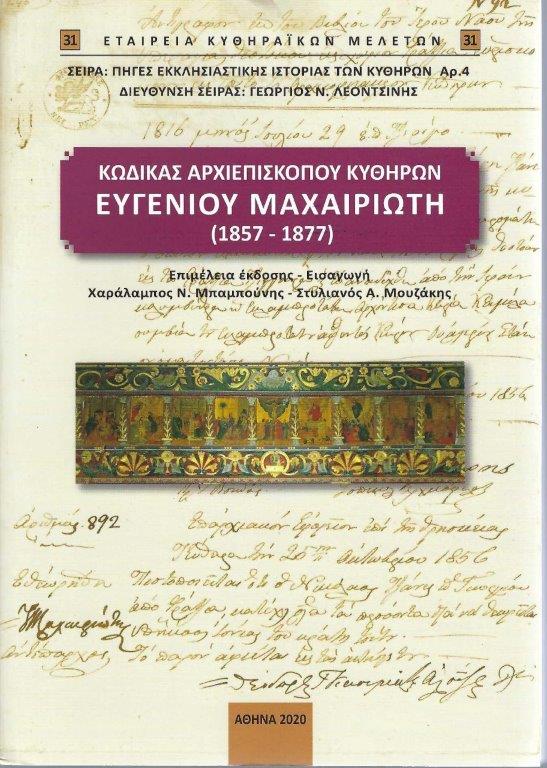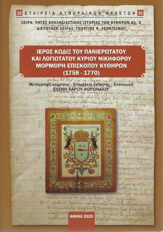- Στη σειρά Πηγές Εκκλησιαστικής Ιστορίας των Κυθήρων, που διευθύνει ο Ομότιμος Καθηγητής του ΕΚΠΑ κύριος Γιώργος Λεοντσίνης, εκδόθηκαν δυο τόμοι: α) το βιβλίο της κυρίας Ελένης Χάρου με τίτλο Ιερός Κώδιξ του Πανιερωτάτου και Λογιωτάτου Κυρίου Νικηφόρου Μόρμορη Επισκόπου Κυθήρων (1758-1770), που φέρει αύξοντα αριθμό 30 και β) το βιβλίο των Χ. Μπαμπούνη, καθηγητή του ΕΚΠΑ, και Στ. Μουζάκη, ιστορικού, με τίτλο Κώδικας Αρχιεπισκόπου Κυθήρων Ευγενίου Μαχαιριώτη (1857-1877), με αύξοντα αριθμό 31.