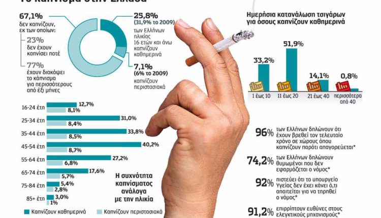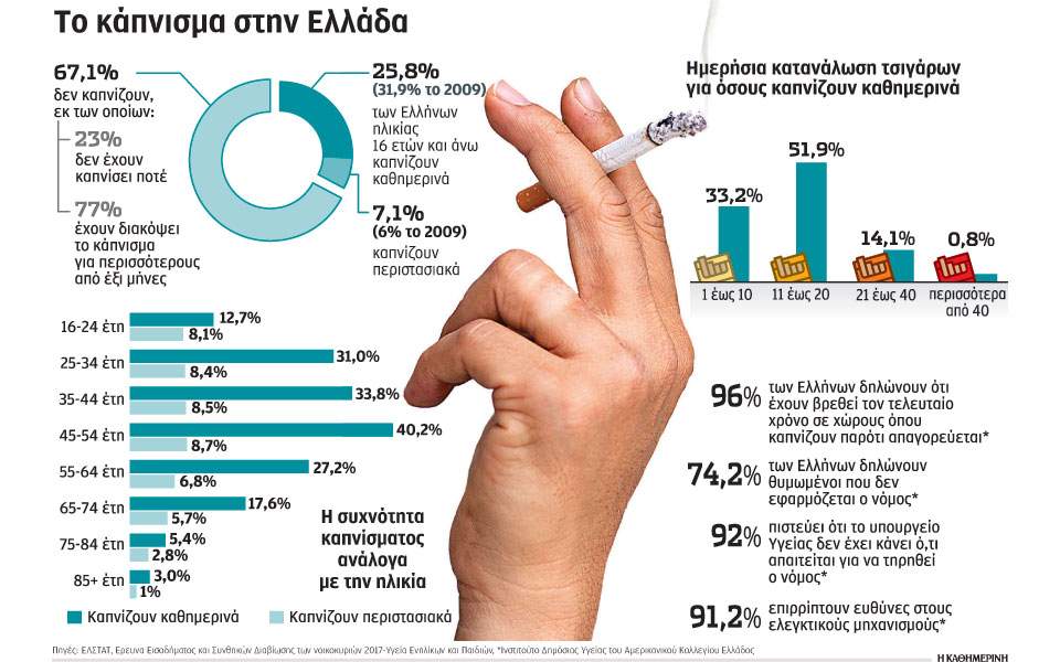 Oμως μιλάμε για μία από τις ελάχιστες εξαιρέσεις στον κανόνα. Eναν κανόνα που θέλει γεμάτα τασάκια και ατμόσφαιρα θολή από τον καπνό στα περισσότερα καφέ, μπαρ και εστιατόρια της χώρας χωρίς ουσιαστικό έλεγχο και παρά το γεγονός ότι η κατάσταση αυτή εξοργίζει μεγάλο μέρος των πολιτών και θεωρείται «ξεπερασμένη» από τους νέους. Τα τελευταία στοιχεία καταδεικνύουν ότι η συντριπτική πλειονότητα των νέων στη χώρα μας δεν καπνίζει. Σύμφωνα με την τελευταία καταγραφή της ΕΛΣΤΑΤ για το 2017, το ποσοστό των νέων ηλικίας 16-24 ετών που καπνίζουν καθημερινά είναι 12,7% και όσων καπνίζουν περιστασιακά 8,1%. Η «στροφή» των νέων έχει την εξήγησή της στη μεγάλη εκστρατεία που έγινε τα τελευταία χρόνια τόσο στα σχολεία, όσο και στο ευρύ κοινό για τις επιπτώσεις του καπνίσματος. Στο σύνολο του πληθυσμού άνω των 16 ετών, συστηματικοί καπνιστές είναι το 25,8%, –ποσοστό που είναι στον μέσον όρο των χωρών της Ε.Ε.– ενώ περιστασιακά καπνίζει το 7,1%. Το 2009, σε αντίστοιχη έρευνα της ΕΛΣΤΑΤ, συστηματικός καπνιστής δήλωνε το 31,9% των Ελλήνων και περιστασιακός το 6%.
