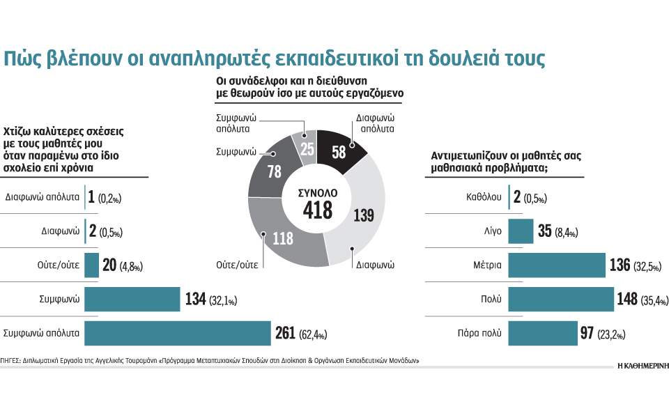 «Μεταξύ άλλων βρέθηκε ότι οι αναπληρωτές εκπαιδευτικοί είναι ένα εργατικό δυναμικό με ζήλο που επηρεάζονται αρνητικά από την άνιση μεταχείριση στον χώρο του σχολείου σε σχέση με τους μόνιμους συναδέλφους τους και σε μεγάλο ποσοστό σκέφτεται να εγκαταλείψει το επάγγελμα λόγω της ανασφάλειας και των διαρκών μετακινήσεων», σχολιάζει στην «Κ» η κ. Τουραμάνη. Σημειώνεται ότι οι αναπληρωτές βρίσκονται στον δρόμο τις τελευταίες ημέρες αντιδρώντας στον νέο νόμο περί διορισμών, ζητώντας να μοριοδοτείται πρωτίστως η προϋπηρεσία (το σχέδιο νόμου μοριοδοτεί εξίσου την προϋπηρεσία με τα ακαδημαϊκά προσόντα). «Μετράμε δέκα χρόνια χωρίς διορισμούς και με χιλιάδες συνταξιοδοτήσεις», συνεχίζει η ίδια. «Τα σχολεία είναι άδεια. Ο κόμπος έχει φτάσει στο χτένι. Αντίθετα με ό,τι αναφέρει η νομοθεσία, οι αναπληρωτές καλύπτουν πάγιες και διαρκείς ανάγκες και ξεσηκώθηκαν γιατί το νομοσχέδιο επιχειρεί ύστερα από όλα αυτά που έχουν περάσει να τους βάλει σε διαδικασία ανθρωποφαγίας, ενώ κοινός παρονομαστής όλων είναι το πτυχίο και η προϋπηρεσία. Τα μεταπτυχιακά τα κάνουμε με μεγάλο κόστος για να είμαστε καλύτεροι για τα παιδιά. Οχι για να φάμε ζωντανό τον δικό μας δάσκαλο».