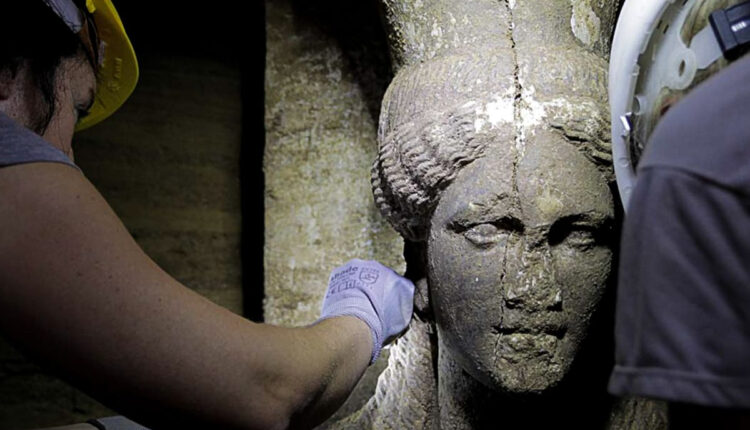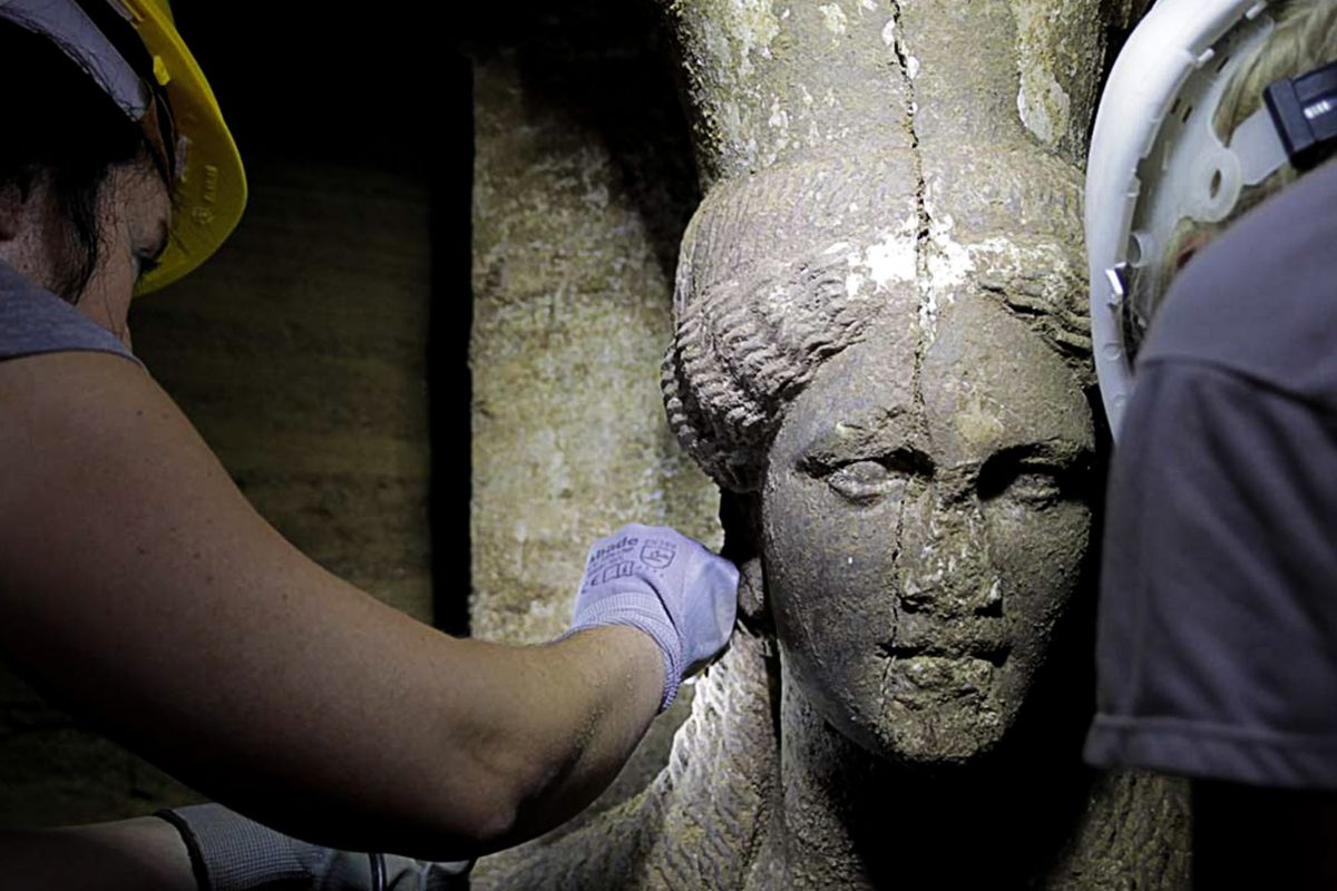 Στις 25 Αυγούστου αποκαλύπτεται η πρόσοψη του μνημείου και μία μέρα μετά εντοπίζεται βοτσαλωτό δάπεδο που αποτελείται από γεωμετρικά σχήματα, ορθογώνια και τετράγωνα, πλαισιωμένα από ρόμβους. Στις 6 Σεπτεμβρίου οι εντυπώσεις και οι προσδοκίες περνούν σε νέα διάσταση, καθώς αποκαλύπτονται δύο Καρυάτιδες, επίσης από μάρμαρο Θάσου, με κόμη που πέφτει στους ώμους, χιτώνα και σκουλαρίκια. Επί πολλές ημέρες η εικόνα τους συνοδεύει ρεπορτάζ, ζωντανές συνδέσεις και αφιερώματα επί αφιερωμάτων. Η περιέργεια όλων για τη συνέχεια φτάνει σε σημείο εμμονής.