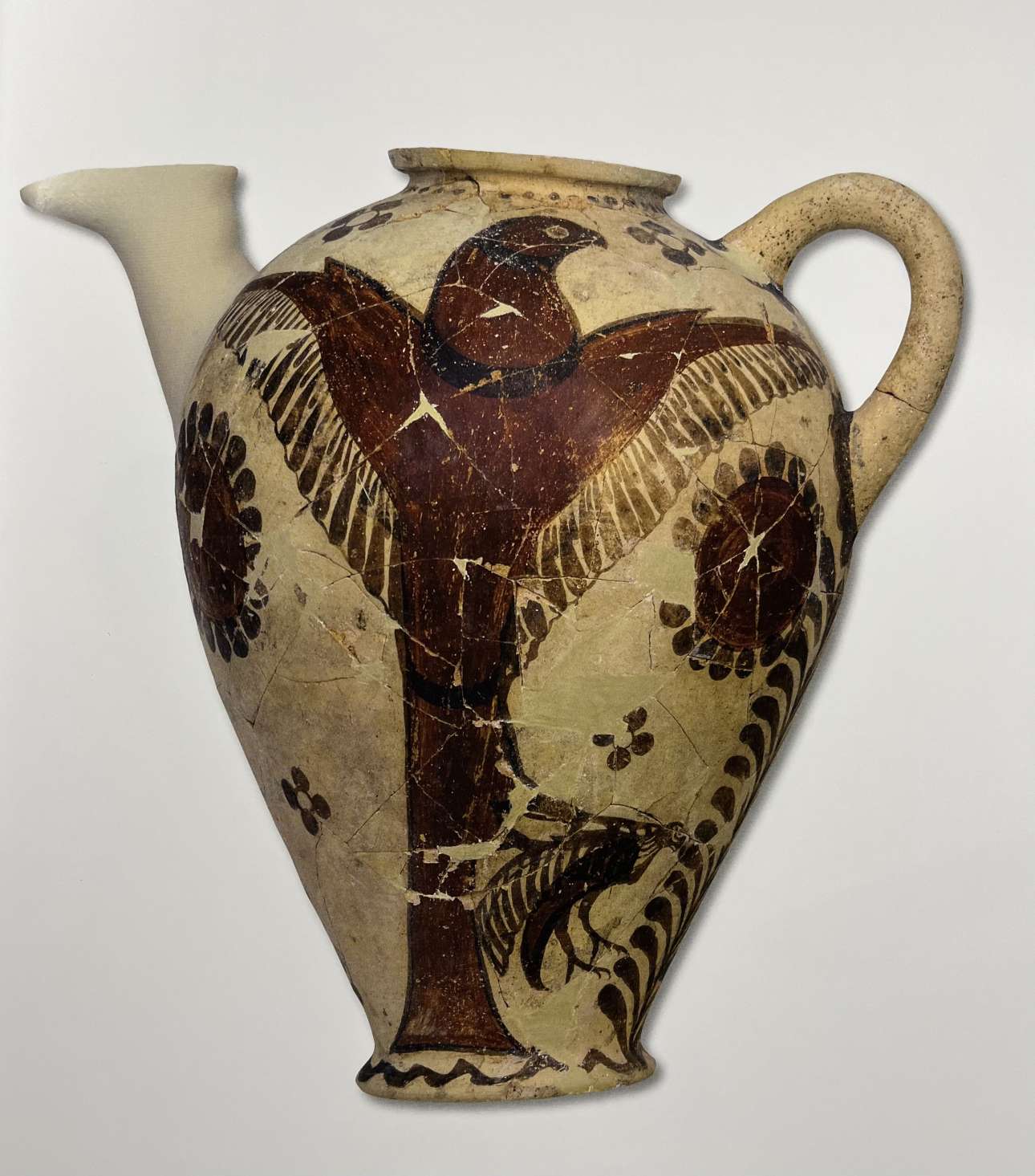 Μοναδικό δείγμα του δίχρωμου ρυθμού είναι η άριστα διατηρημένη πρόχους. Στην αριστερή πλευρά ένας αετός με ανοιγμένα τα φτερά, σαν να τον βλέπει κανείς από το έδαφος, εικονίζεται να μεταφέρει τον νεοσσό του (αετιδέα) κρατώντας τον με τα νύχια. Στη δεξιά πλευρά δύο ανδρικές μορφές στέκονται αντικριστά γύρω από ένα δέντρο. Οπως αναφέρει ο Χ. Ντούμας, «αν σκοπός του αετού ήταν να μυήσει τον αετιδέα στην τεχνική της πτήσης, θα μπορούσε να υποστηριχθεί ότι το σκεύος προοριζόταν για τελετουργίες μύησης».