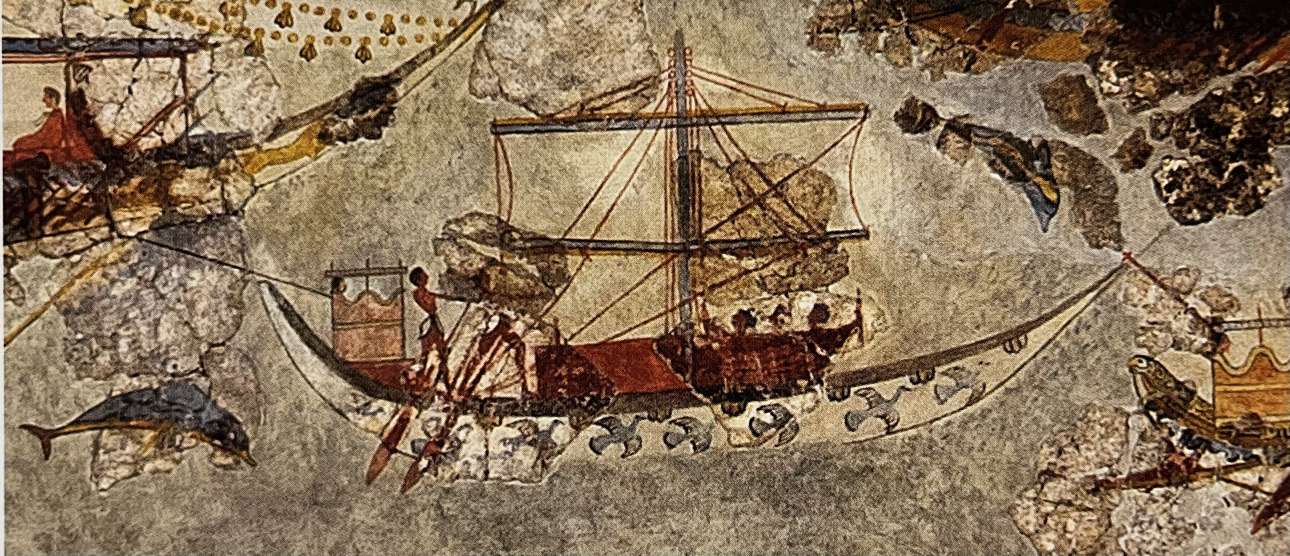 Στη Δυτική Οικία του Ακρωτηρίου έχει διασωθεί ζωφόρος με την αναπαράσταση μίας νηοπομπής. Ένας στολίσκος ιστιοφόρων πλοίων αποπλέει από ένα μακρινό λιμάνι (η αριστερή πλευρά της τοιχογραφίας), μάλλον εξωτικό, όπως δείχνει η χλωρίδα της αναπαράστασης, και ύστερα από διάφορα στάδια καταπλέει στο λιμάνι της Θήρας. Ακριβώς στο κέντρο δεσπόζει (όχι καλά διατηρημένο) μικρό σκάφος με ανοιγμένα πανιά. Πρόκειται προφανώς για τον «αγγελιοφόρο» της νηοπομπής, όπως υποδηλώνουν και τα περιστέρια που εικονίζονται με ανοιχτές φτερούγες στα πλευρά του.
