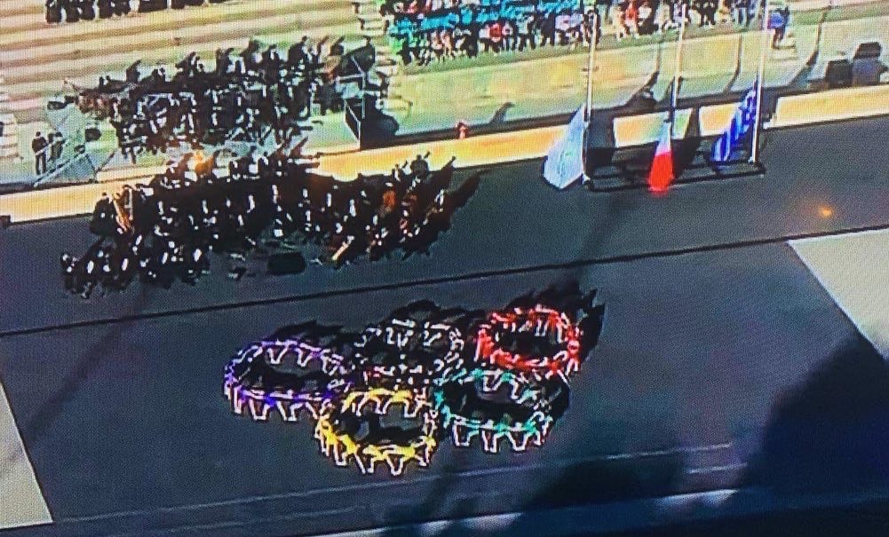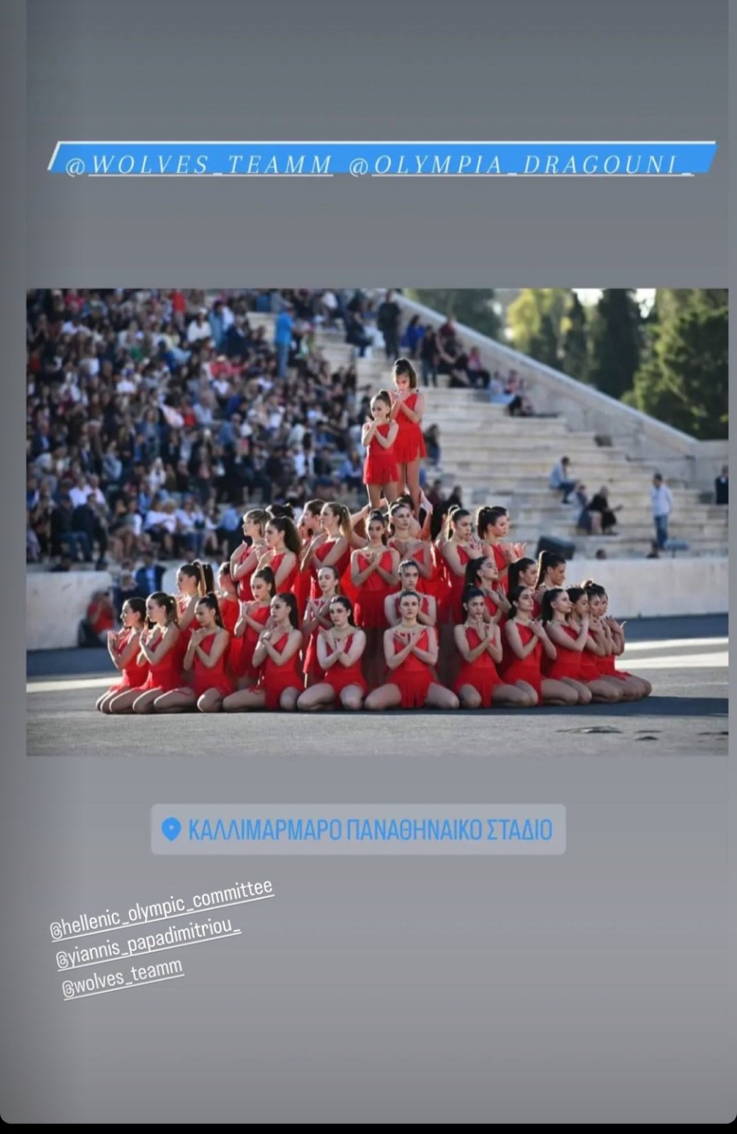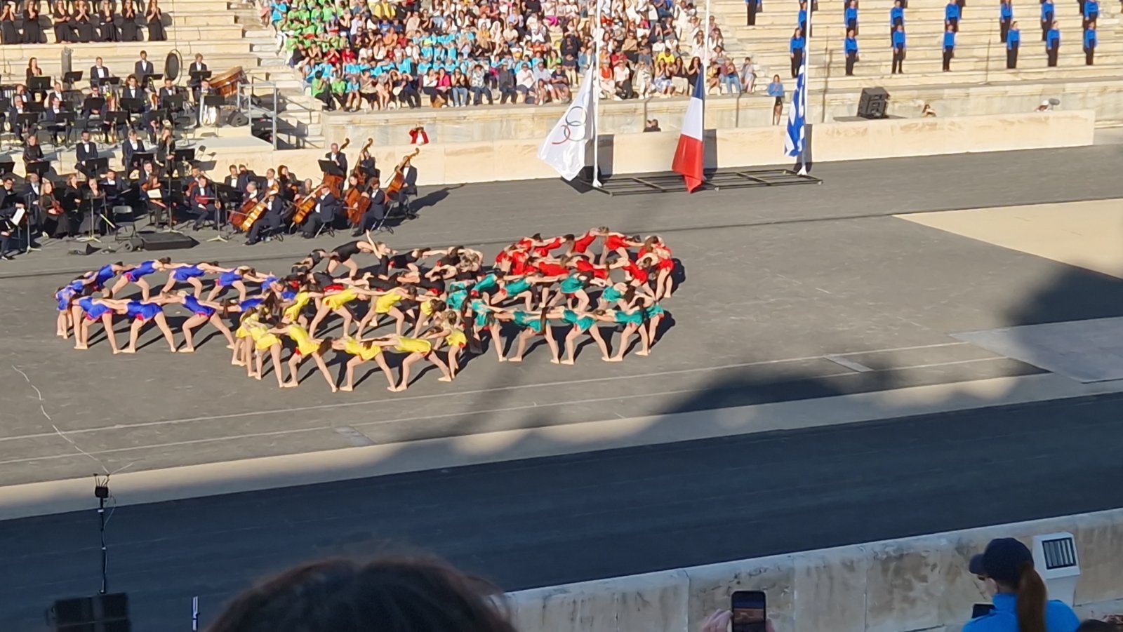 Η εμβληματική αυτή τελετή που παρουσίασε ο Νίκος Αλιάγας, άνοιξε με το Πολιτιστικό – Αθλητικό Δρώμενο της Ελλάδας «Ολυμπιακοί κύκλοι για το Παρίσι 2024, από την Παγκόσμια Πρωταθλήτρια ομάδα Γυμναστικής, «Wolves Team – Gymnastics Club» υπό την καλλιτεχνική διεύθυνση της επικεφαλής της ομάδας Ολυμπίας Δραγούνη σε χορογραφία Κάρλεν Καραευαγγέλου, Μαριλού Ξενοπούλου και Γαβριέλας Καραγιάννη. Στο δρώμενο συμμετείχαν 60 επίλεκτες αθλήτριες της «Wolves Team», μεταξύ των οποίων και δύο αδελφές από τα Κύθηρα της Ελευθερίας Μασσέλου και της Καλλιόπης Μασσέλου. Οι αθλήτριες της ομάδας εκτέλεσαν το εκπληκτικό, υψηλής αισθητικής και ιδιαίτερων αθλητικών απαιτήσεων μουσικοχορευτικό πρόγραμμα, στο οποίο κυριάρχησε το κόκκινο χρώμα συμβολίζοντας την Ολυμπιακή Φλόγα, με ιδιαίτερη χάρη, αρμονία και απόλυτη ακρίβεια κατά την εναλλαγή της κίνησης. Στην εξέλιξη της χορογραφίας τα κόκκινα φορέματα των αθλητριών μεταμορφώθηκαν στα πέντε χρώματα των ολυμπιακών κύκλων που εκπροσωπούν τις πέντε ηπείρους! Η υπέροχη αυτή παρουσίαση κορυφώθηκε με το σχηματισμό των ολυμπιακών κύκλων, προκαλώντας σε όλους δέος και συναισθήματα συγκίνησης και περηφάνιας για τα παιδιά μας και την Ελλάδα μας.